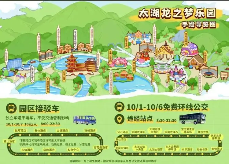 - 免费接驳:部分酒店与核心园区(如动物世界、太湖古镇)可步行抵达;酒店之间有免费接驳车(需咨询酒店前台发车时间)。