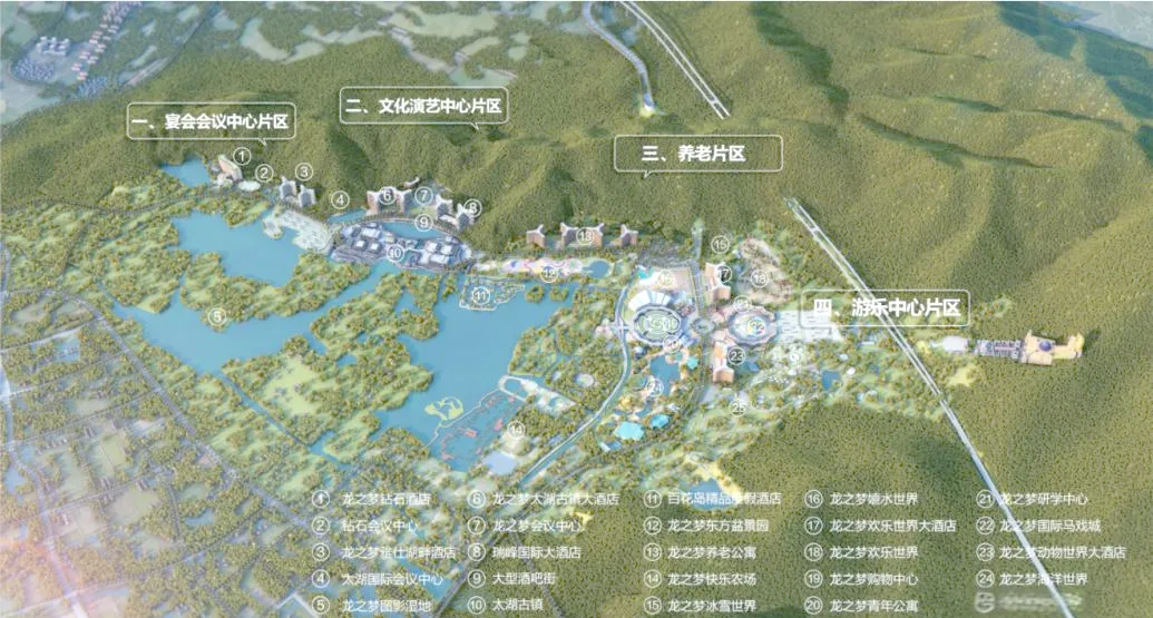 太湖龙之梦乐园分为五大片区:宴会会议中心片区、文化演艺中心片区、游乐中心片区、养老片区以及太湖药师道场片区,核心游玩业态集中在文化演艺和游乐中心片区,主要包括以下6大核心板块,各板块独立售票、分散布局,建议按“就近原则”规划行程,避免来回奔波: