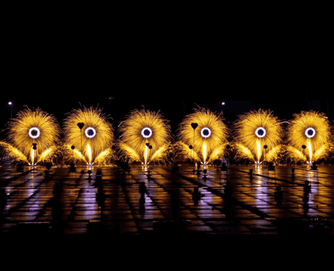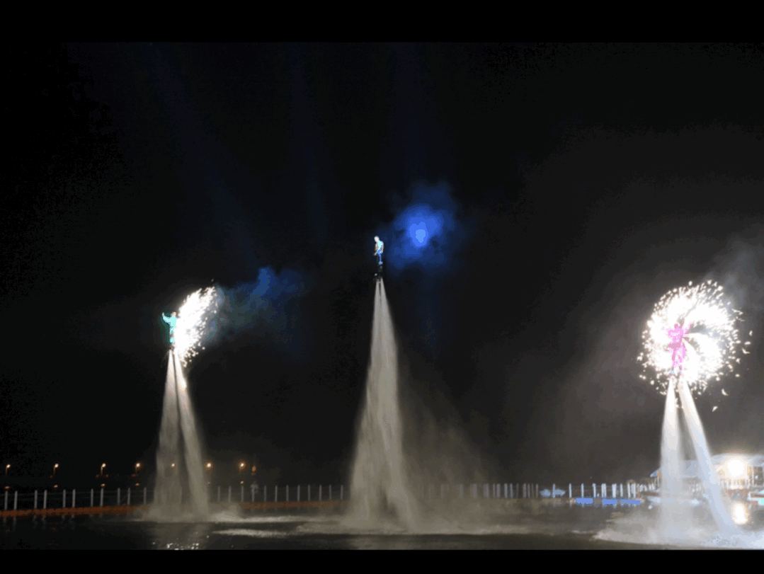 扣人心弦的水上飞人,在夜晚炫彩灯光特效下,犹如蝴蝶翅膀,火花燃气那一刻,宛若夜空中最亮的星。
