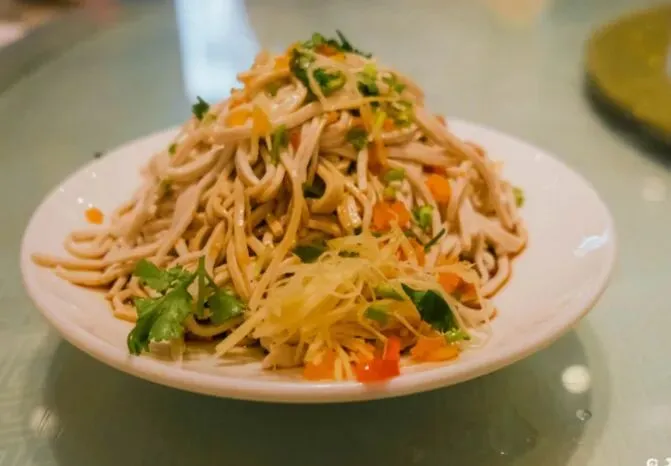 泰州 早茶的传统是“一茶三点一面”,最先奉上桌的便是一杯盖碗茶、一份烫干丝。“福香茶” 融魁针之色、珠兰之香、 龙井 之味于一体,轻呷一口,困倦之意便一扫而空,配上一撮柔滑清爽的烫干丝,那闲情雅致便油然而生。