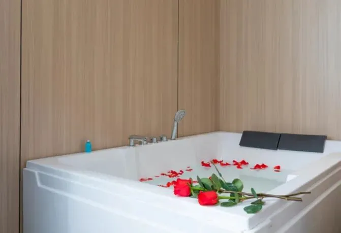 房间里配置了一个大浴缸,服务生会帮忙放好热水,撒上花瓣,惬意的入浴洗去一天的疲惫。哈哈~