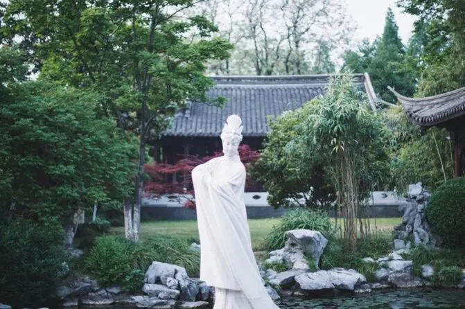 在梅园中间有一处水池,水池四周是仿汉 白玉 雕栏,水池中间有一汉 白玉 雕像,她是梅兰芳在《太真外传》中饰演的杨太真,造型优美,神态逼真,如出水芙蓉。