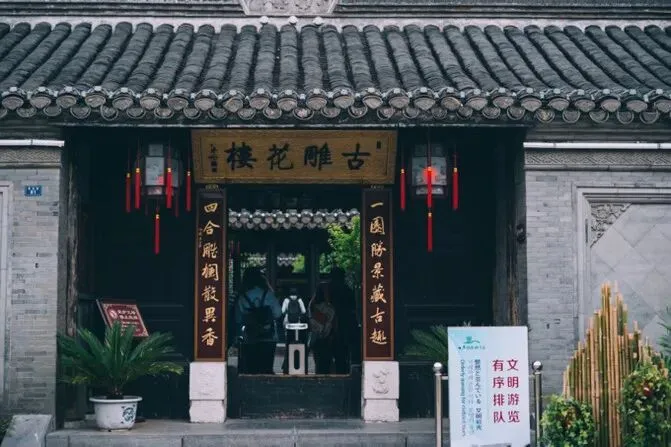 古雕花楼又称口岸雕花楼,于清乾隆四年正式建成,位于 泰州 大江之滨的高港,由以为来自 江南 的木材商人姚氏所建,楼面东而置,重檐硬山,上下两层,面阔五间,气势非凡,后因经营不善,易主当地富豪李松如,李买得姚氏楼屋后在原基础上进行了扩建,不仅在旧楼屋的西侧仿建了一座同样的后楼,而且还在新旧两楼间加建了二座厢楼,使原来单一的楼房变成了一组四方楼,面积扩大了两倍之多。