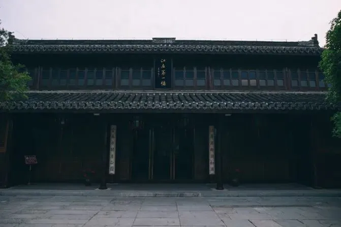 园内的建筑气势非凡,檐角分明,同样的 江南 园林式布局,有山有水,树木葱郁。中间那座建筑如一像正在航行的船只一样屹立水面,对联“石舫能行千古月,木排好趁一江风”,寓意乘风破浪,大好前程。