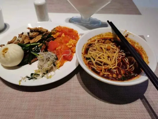 酒店在自助早餐,味道不错,种类也属比较齐全的 早晨有各种面食炒菜啥的。吃一顿元气慢慢~