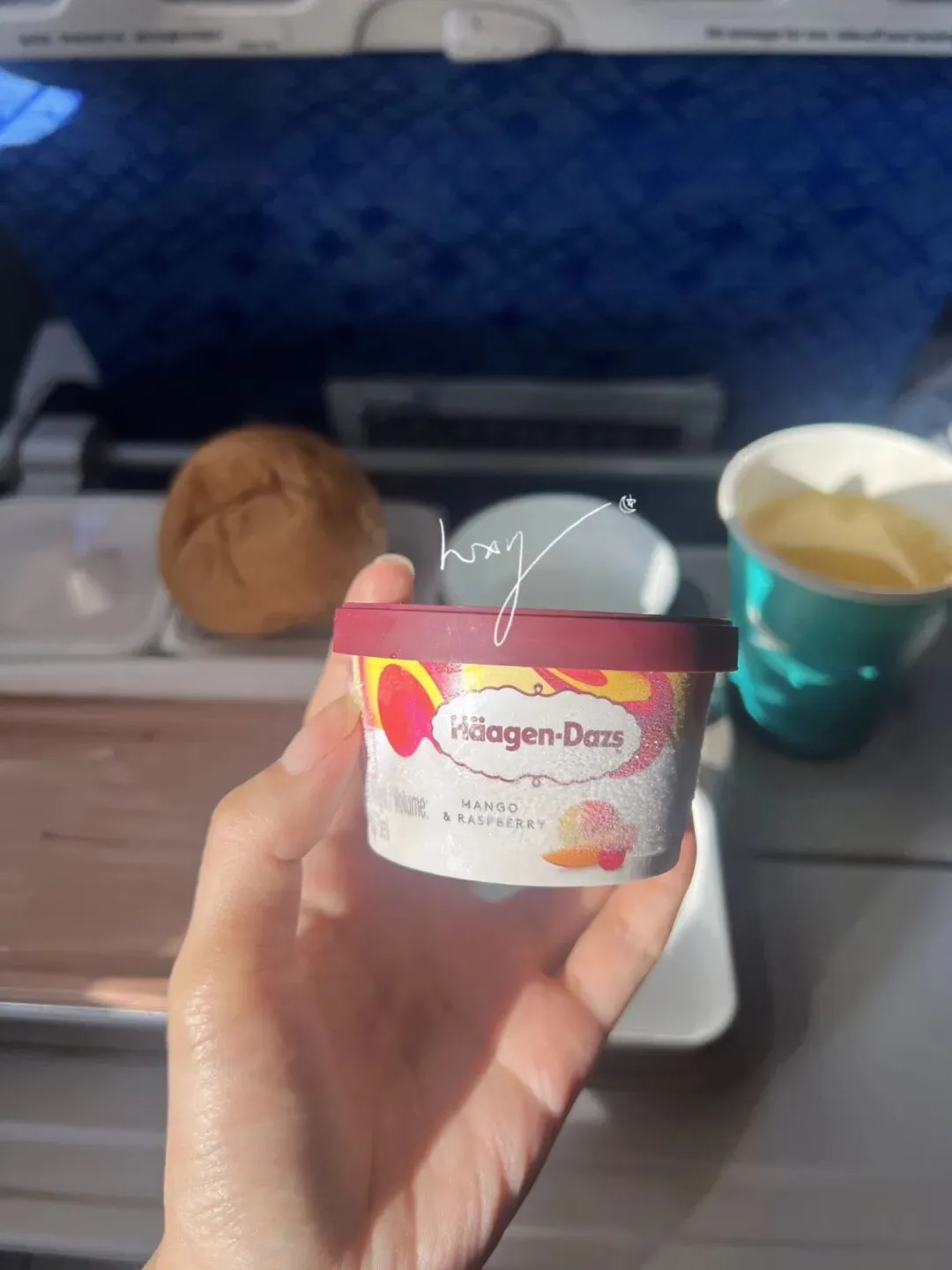 餐食里网上都在夸有哈根达斯冰淇淋,嗯,确实是有。但是哈根达斯冰淇淋太甜了,看了四周的乘客有不少人是不打开吃的😂。