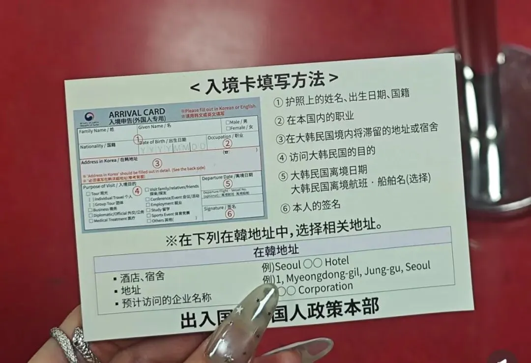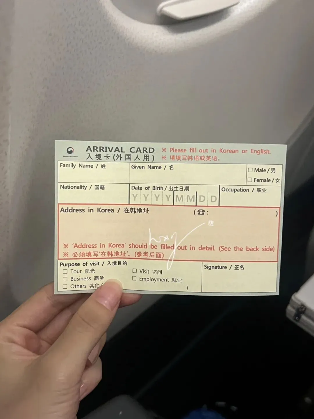 2️⃣纸质版入境卡 纸质版的在入境卡是在飞机上到达首尔仁川机场还有半个小时的时候空乘人员会发放的,然后这个卡在飞机上和到了首尔仁川机场都会有,哪怕飞机上没拿,到仁川机场也有入境卡,一路走可以看到,自己拿自己写。 纸质版的背面有中英文填写教程,不用担心不会写。填写的时候用英文填写就行。