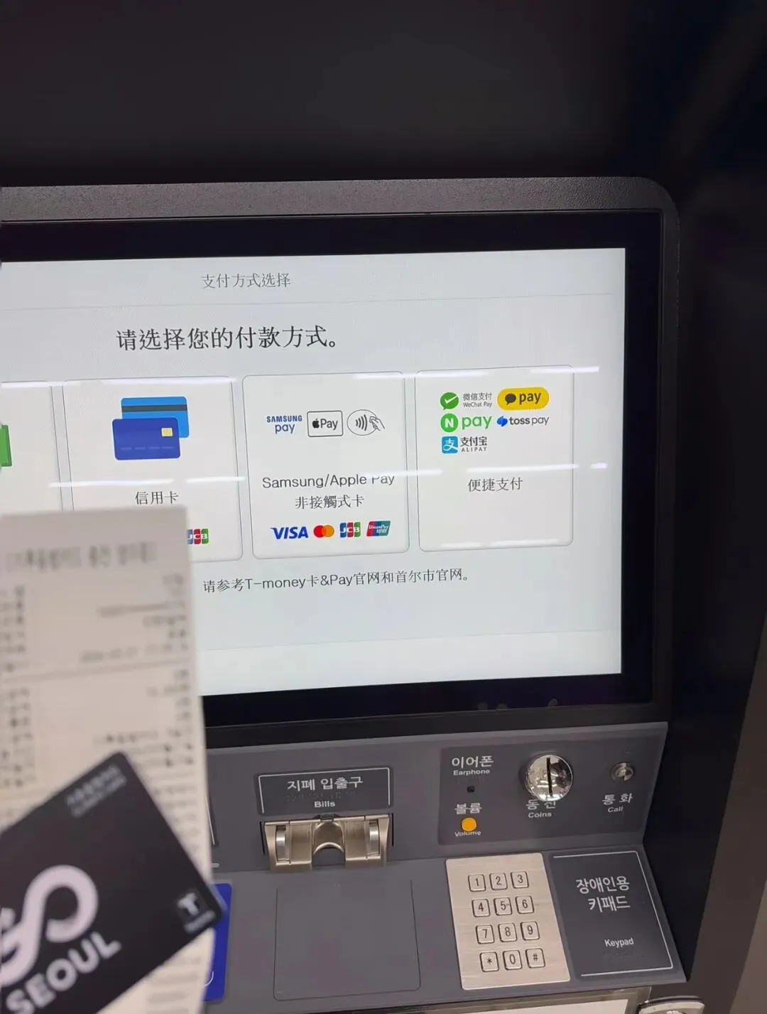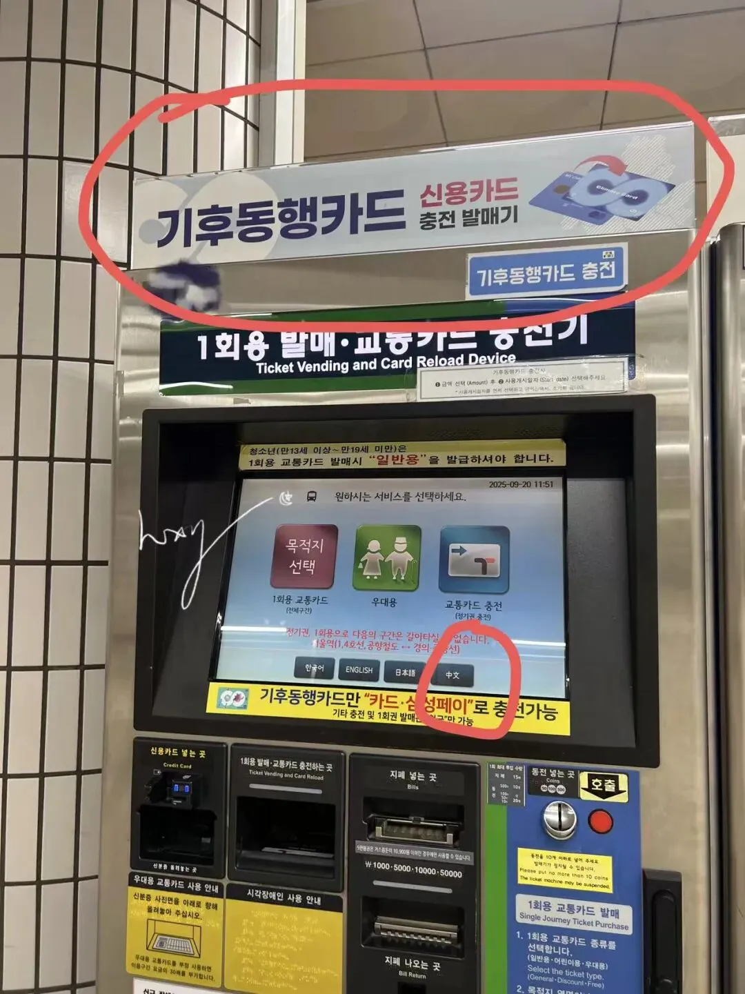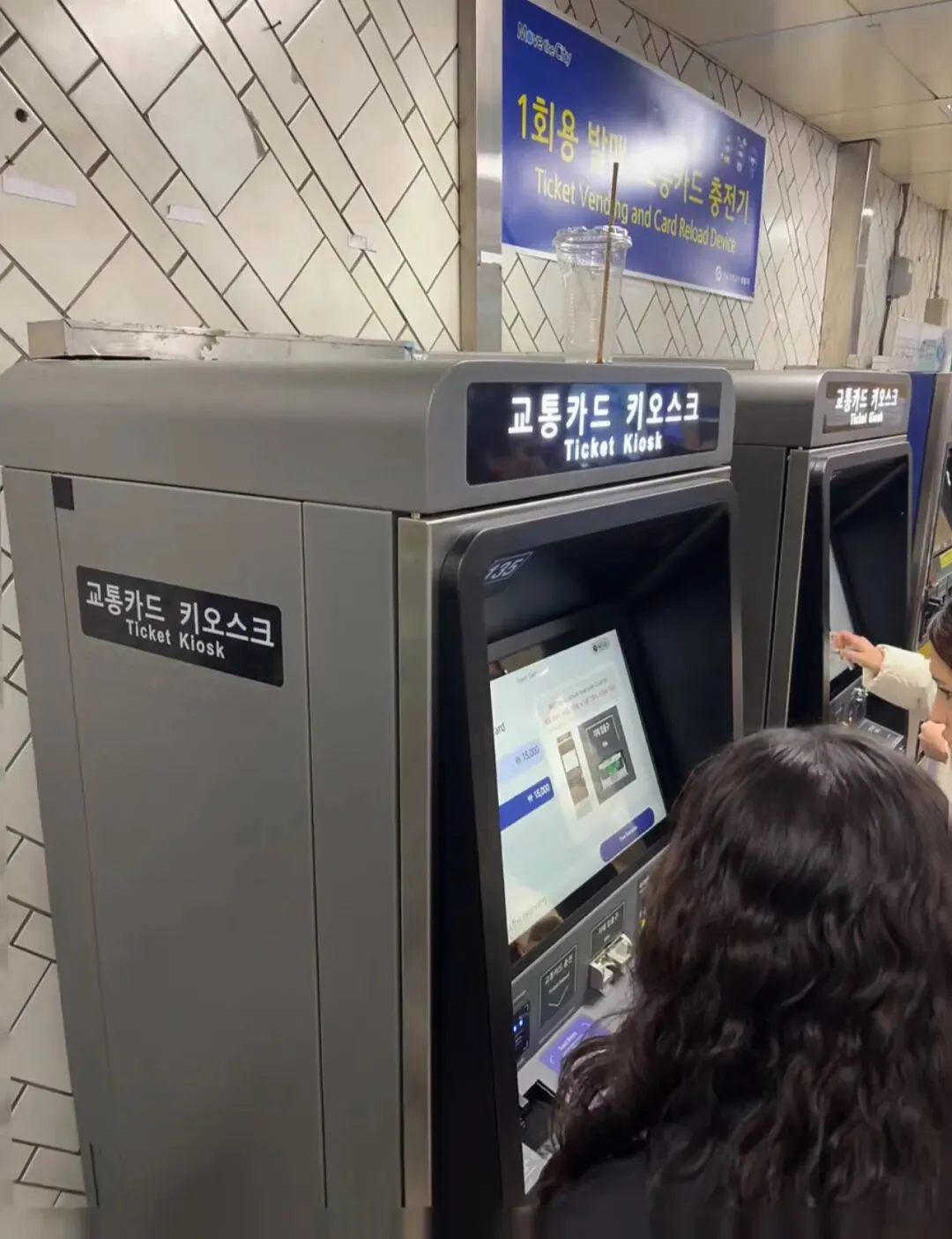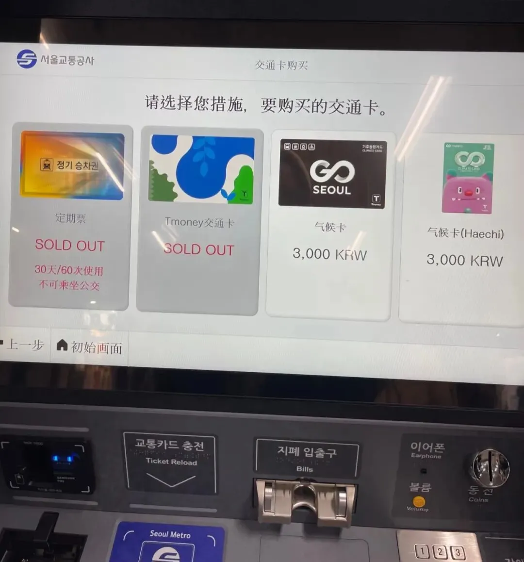 2️⃣市区地铁站的充值柜机 有中文选项,不用担心不会韩文。 黑色和彩色卡通两种卡面可以选,也是3000韩元一张。机子上现买现充,买了就能直接充。