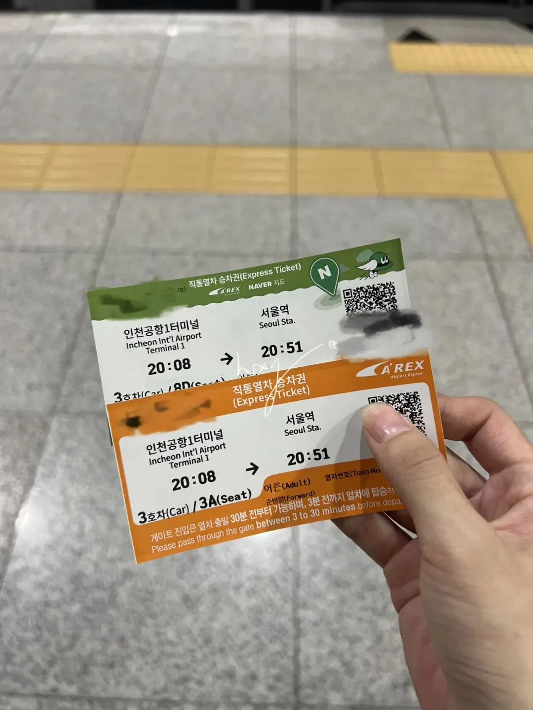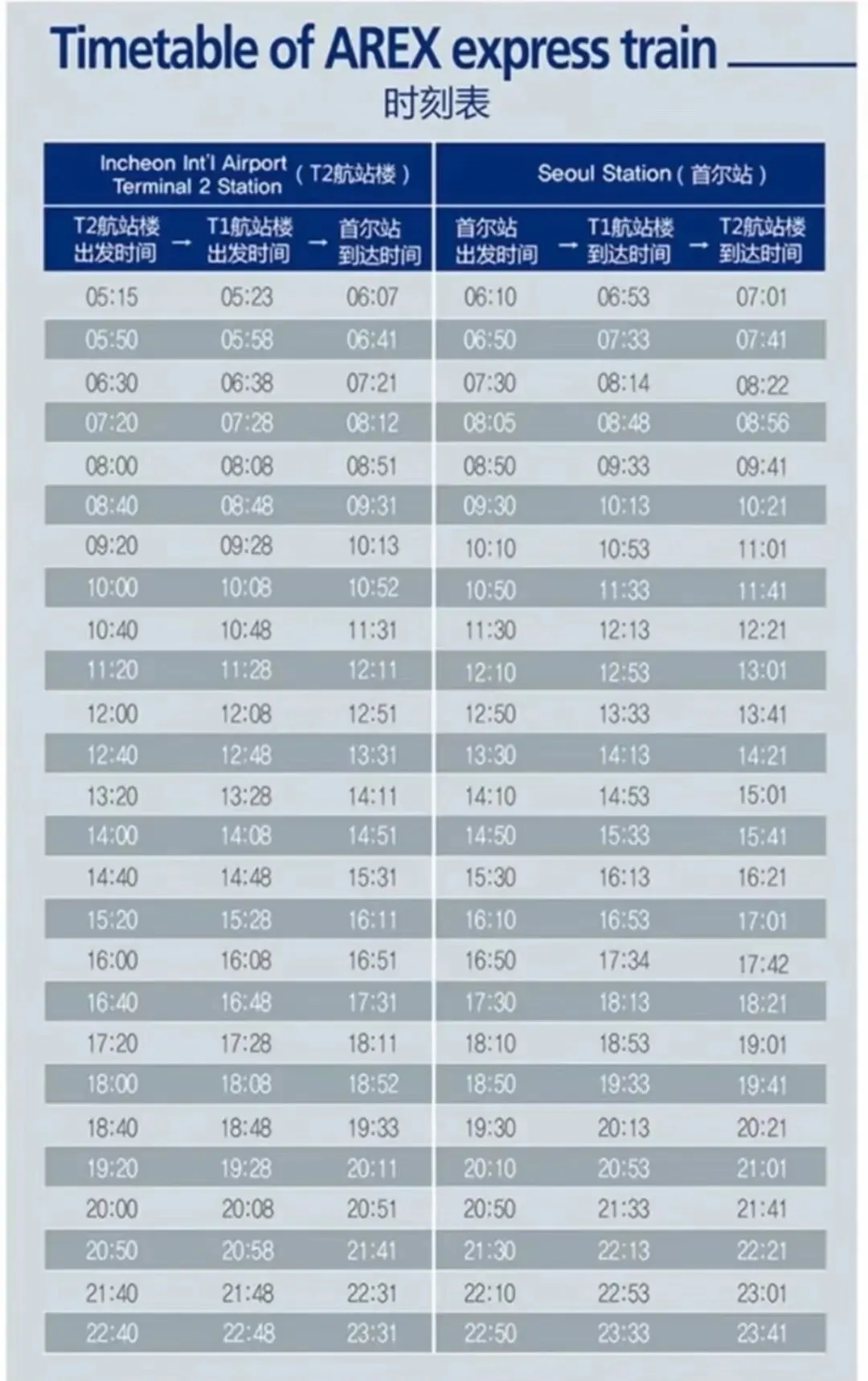 仁川机场T1直达首尔站方式 其他方式我就不介绍了, 分享我坐的方式:Arex机场快线 选择Arex快线的理由是快且舒适。 车上有卫生间也有免费的水。 时间上: 仁川机场T1到首尔站43分钟 仁川机场T2到首尔站51分钟 中途不停,超快捷 。 价格上: Arex要留意携程经常有买一送一的活动,我们当时看到了但是没买 ,好蠢😂。因为当时计划是打的去酒店,晕机受不了就换路线了。后来在现场买的,现场买是13000韩币一个人。 时刻表: