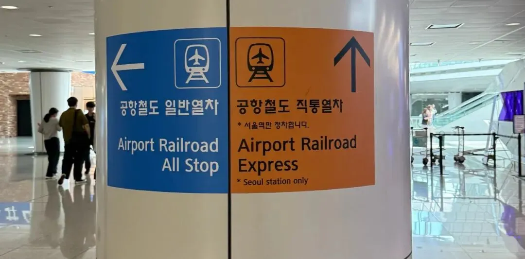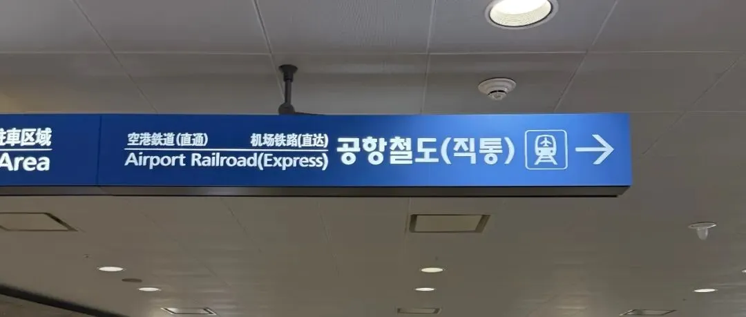 怎么去Arex坐车攻略: ①刚开始看准橙黄色的标志,机场铁路方向。 (我这四种语言里都很熟,比起中文,我看日韩文还更方便理解🤣,不会其他语言的朋友就看中文机场铁路四个字)