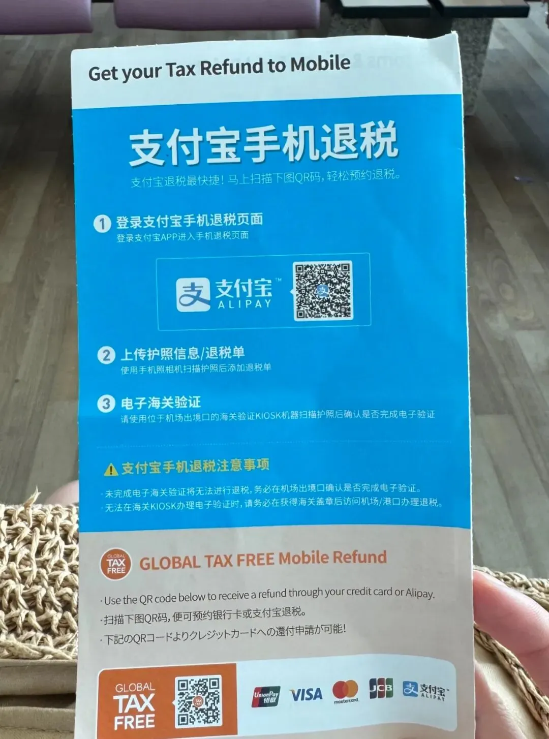 2️⃣出行方式 到机场依然是地铁+Arex机场快线的方式。 酒店搭乘地铁到首尔站,再从首尔站坐Arex到仁川机场T1。和来的时候是一样的,没什么好说的了,看路标指示很方便。 通常首尔圈地铁内去仁川t1都要4400韩币一趟。 3️⃣退税 购物的时候要确认好能不能退税,有退税的店铺都会在收银的地方写的很清楚。付款完,收银员都会给包装好的退税信封,一定要保存好,不能弄丢。然后给的退税单里也有一些说明,比如可以用支付宝退税之类的。 打开他们给的退税信封,支付宝那张卡有说明。