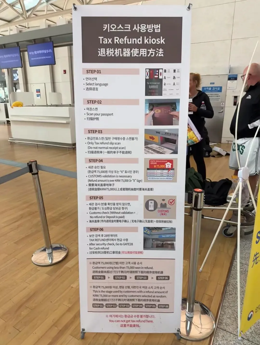 退税可以用支付宝退税,支付宝退税方便,是人民币现金秒入账,但扣手续费和汇率不太好。汇率我个人是觉得不要紧,但买的多的话还是去现场退税,选韩币现金更划算。我当时不懂,以为在支付宝上退税了就不用去现场退税节省时间,然后小额的我先输入了,等大额的输入时显示要海关审核现场退税。哎呀还是要去现场,那还不如全部都拿去现场退。所以有大额的情况下就不用选择支付宝了,反正都要去现场那就全部留着现场退税吧。到机场的时候第一时间先去退税。 看清楚自己的退税需不需要海关审核。 自助退税机器上会显示。 ■如果买的都是小额,那我建议全在支付宝上退税,这样就不用去现场退税,直接节省时间。 ■如果有大额要退税的,不要去自助机退税了,因为机器上也不一定会显示,反正大额都要海关确认的,直接安检后,去28号登机口找海关。 现场退税 现场退税的话,就要第一时间到机场了先去办理退税,因为现场人很多,注意自己的登机时间。 每一步的攻略我都写的很清楚,仔细看看↓ 1.可以先去机器自助退税,在E、J值机口。现场有退税机器使用方法,很简单,在机器上选择中文就行了。