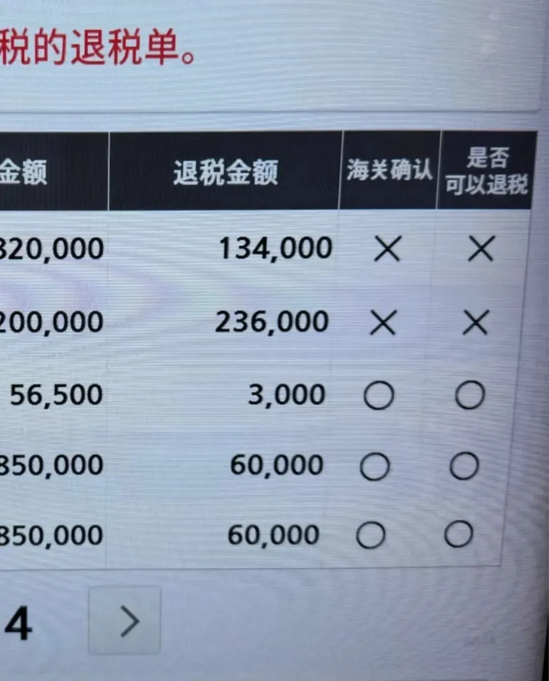 2.在自助机器上能看到哪些能退哪些不能退。扫护照后再把退税单一个一个扫上去,扫二维码或者条形码都可以。自助退税机器上会有XX和OO的显示。如图显示,
