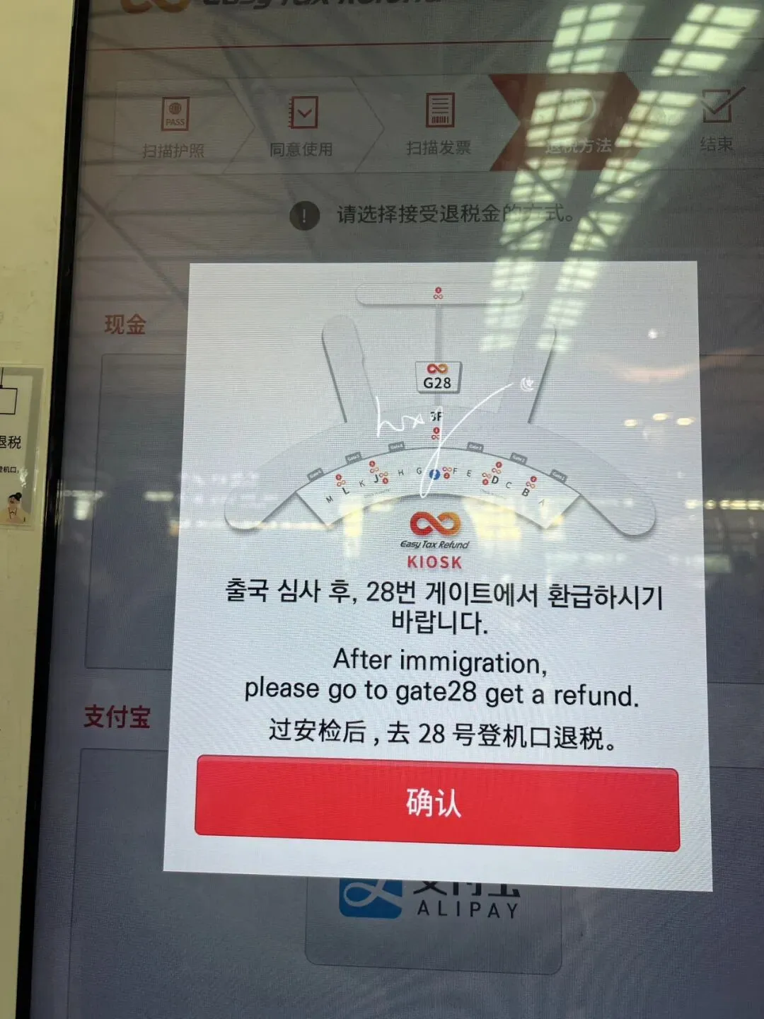①屏幕上显示⭕⭕的,这是不需要海关确认,选现金退税的需要过安检后去28号登机口退税。