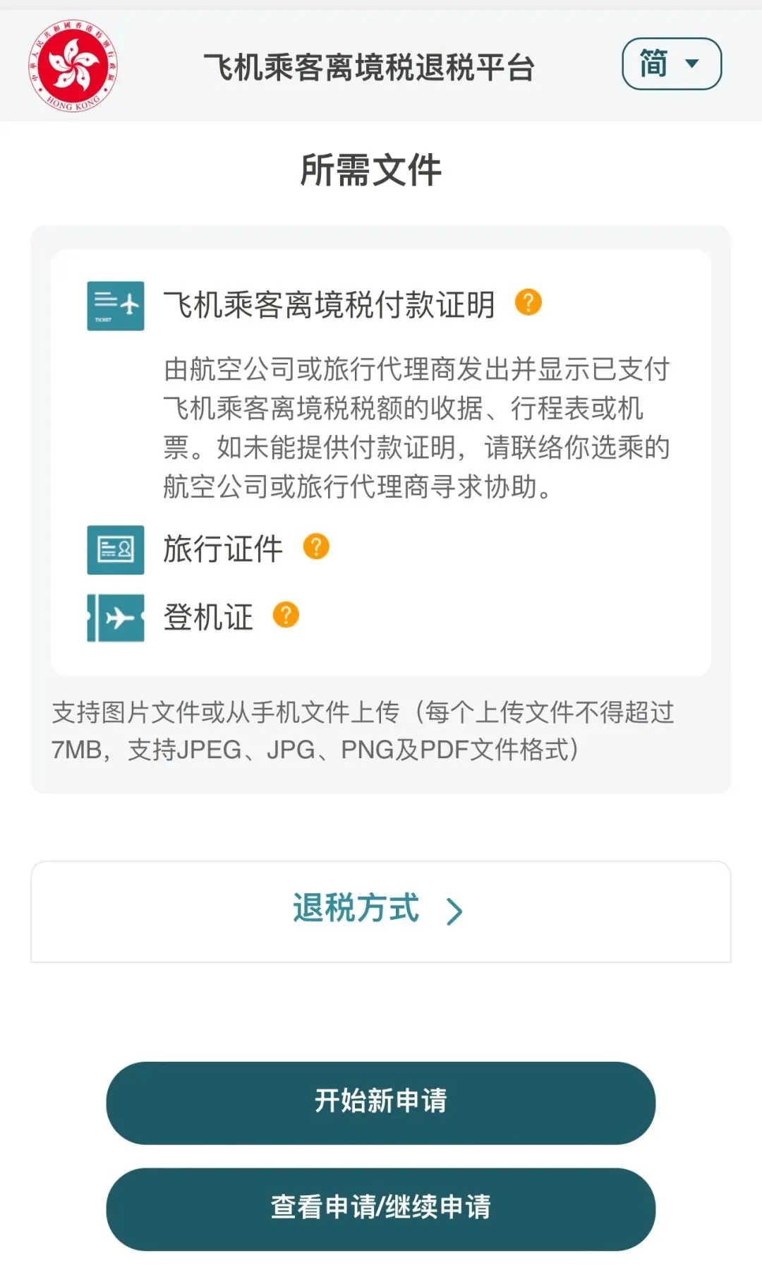 4.开始新申请,申请后续提供所需文件。所需文件有说明,根据说明上传飞机乘客离境税付款证明(机票行程单)、旅行证件(护照)、登记证(机票)这三样。