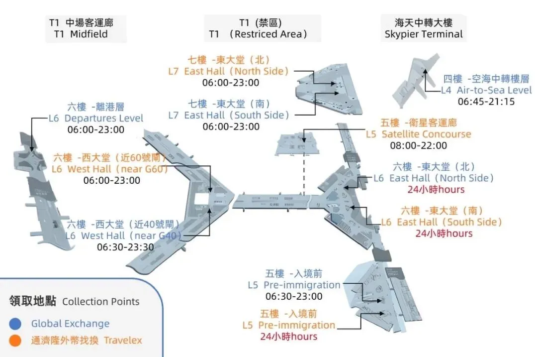 其他航空也是一样找航空公司要机票行程单。 ■飞机票,去程+回程都要,电子或纸质扫描件都可以。■护照,正常上传就行了。 5.把这三个资料提交后,选择退款方式:(支付宝/微信/信用卡/现金) 6.提交后等审核结果就好啦,会通过邮件通知(通常5-7个工作日) 选现金的情况下: 现金要过完安检后,现场柜台拿。 ①global exchange柜台:安检以后,10米步行左侧就有一个。还有位于万宁门口柱子位,营业时间为06:30-23:00。 ②Travelex:位于7-11旁边铺位,24小时营业。 机场所有退税柜台图如下↓