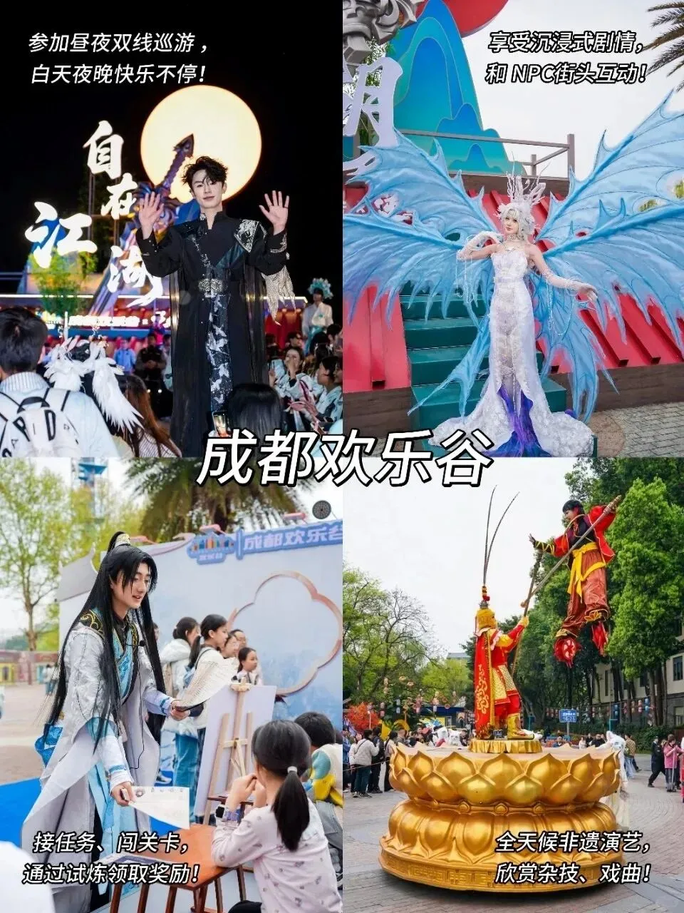 欢乐谷放在最后一天是为了释放,前两天走了那么多路,身体需要一种彻底的放松,国潮文化节不是简单的表演,是让你真正体验一把逍遥江湖人的感受,全园沉浸式剧情让你不再是观众。