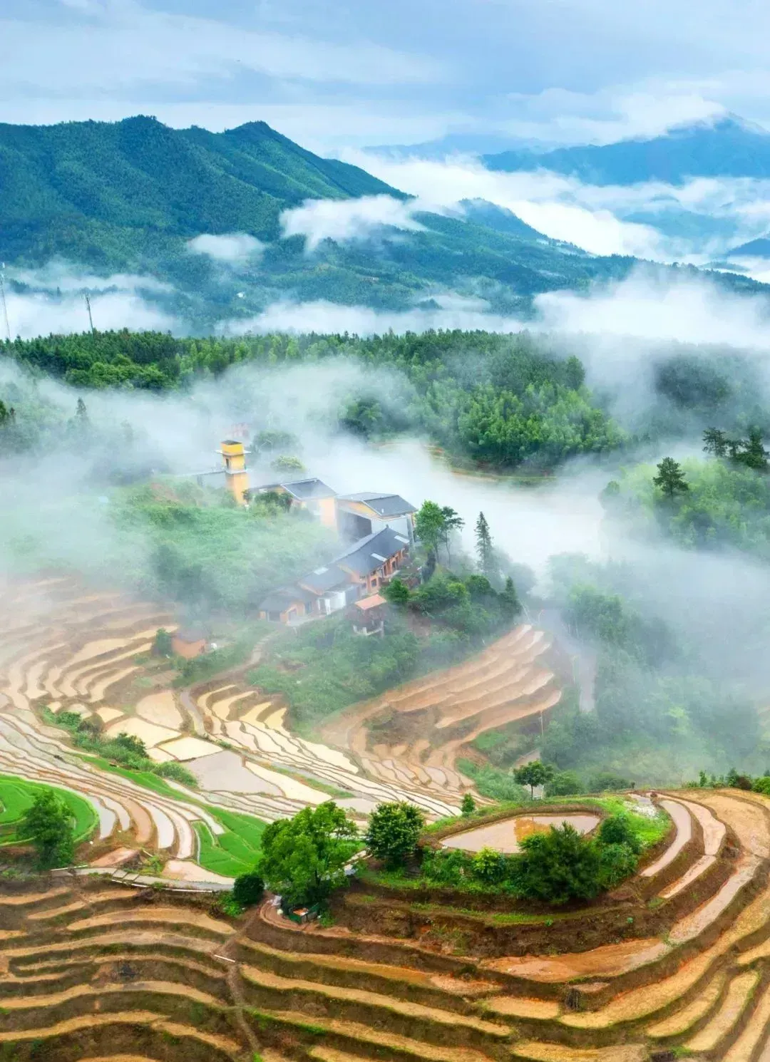 很多人觉得冬天江西没啥看的,但其实赣南那边冬天挺美的,崇义的上堡梯田,冬天注水之后整片梯田变成镜面,能倒映出天空和云,那个场景怎么说呢,有点像云南的元阳梯田,但规模小一些,游客也少很多,你可以慢慢走慢慢看,不会被人群推着走。