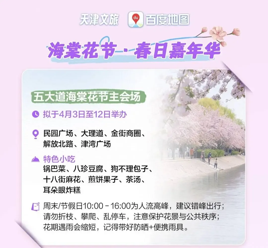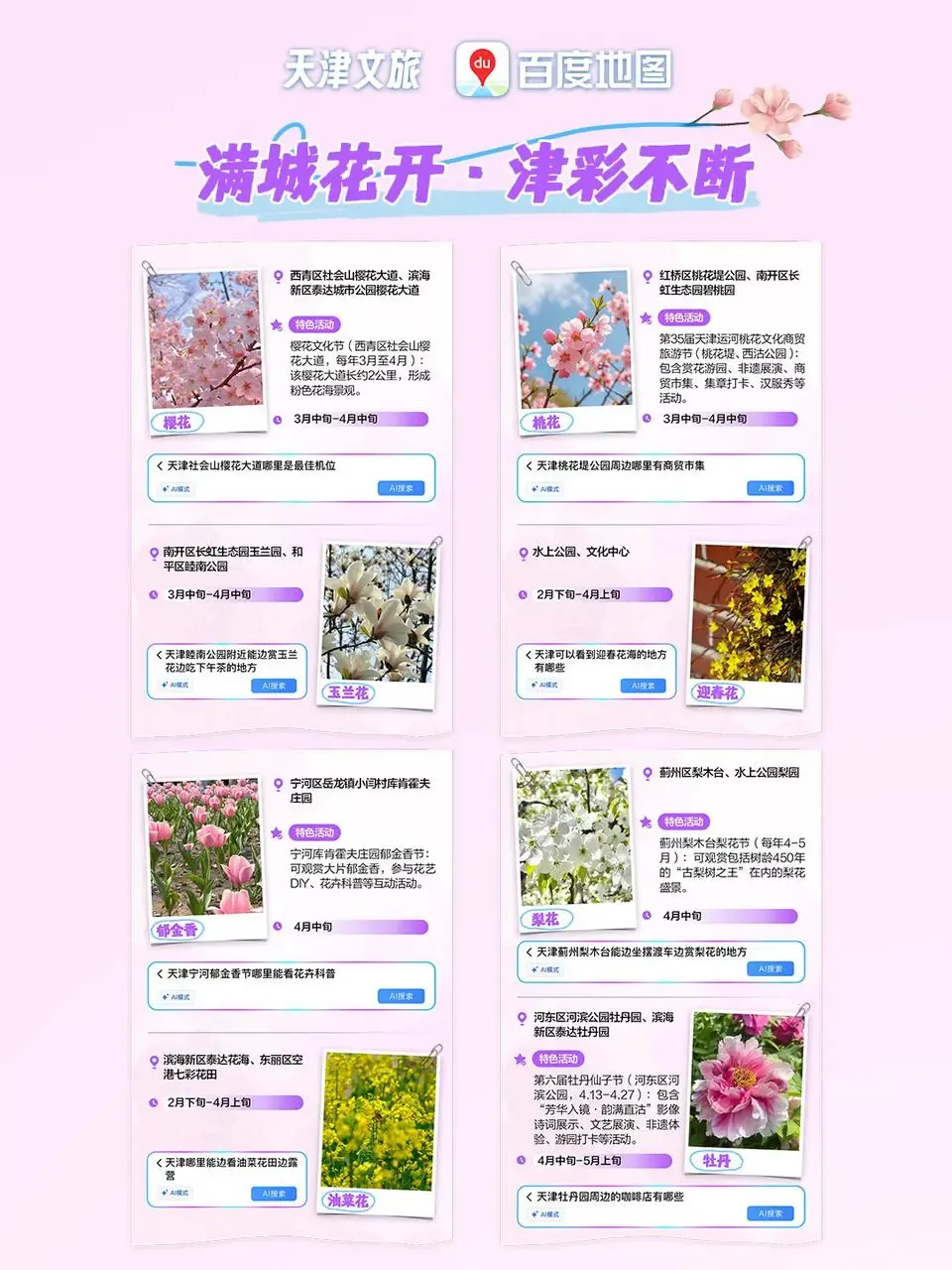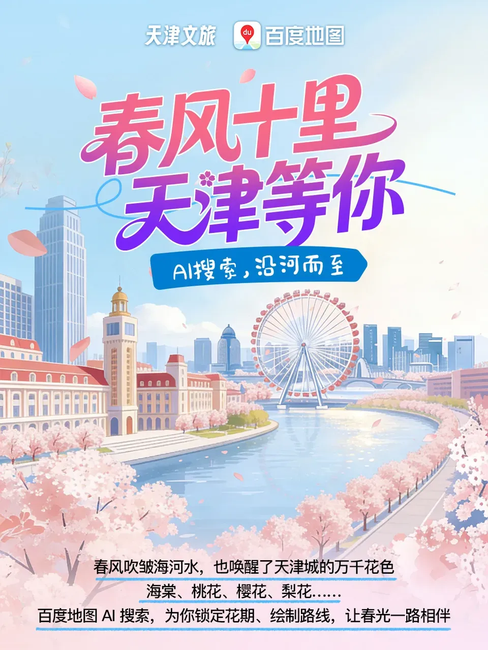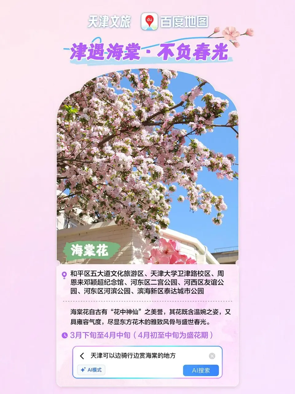 海河的风揉碎了云霞,也把津城的花事悄悄铺展, 五大道的海棠落进洋楼的窗沿, 风一吹,连空气都浸着甜香; 社会山的樱花铺成粉色花毯, 每一步都像踩在春日诗行里; 睦南公园的玉兰衬着老树新枝,开得雅致又热烈…… 每一眼,都是津门春日的“限定浪漫”! 还在纠结春日赏花路线?别担心! 天津文旅携手百度地图,正式推出 「天津赏花地图」 , 一站式承包你的春日出行规划!