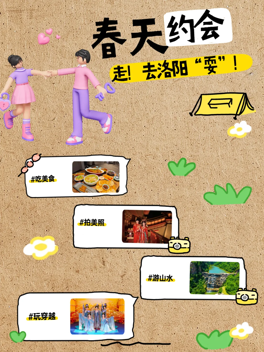 和喜欢的TA,一起吃一顿烟火美食,拍一组治愈大片,走一段山水小径,玩一次穿越潮玩,让每一段相处,都藏着细碎的温柔,让每一次心动,都有洛阳的春风作证。