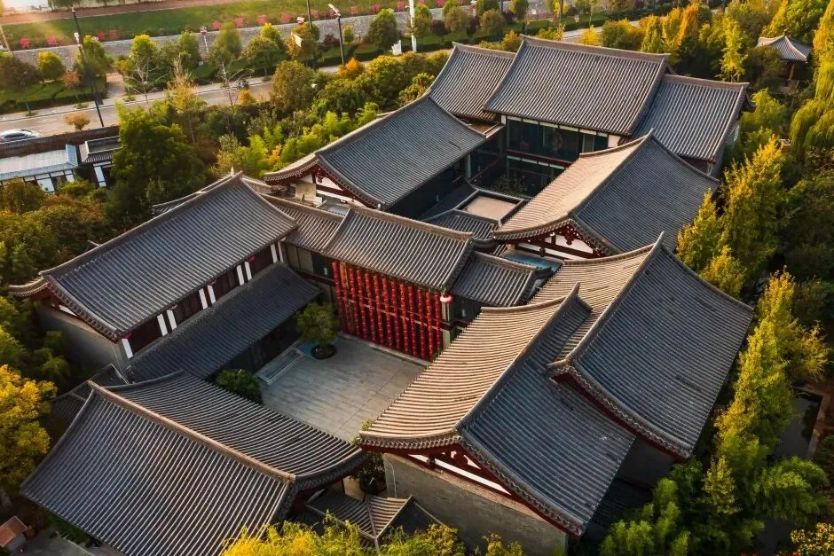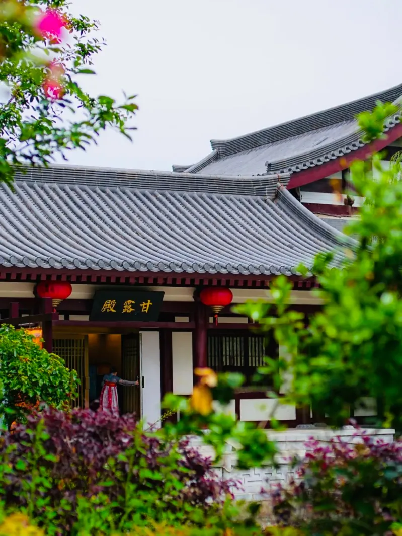 这里是汉服打卡的绝佳地,飞檐翘角的唐风阁楼,朱红廊柱与青砖黛瓦相映,每一处都是天然取景框。