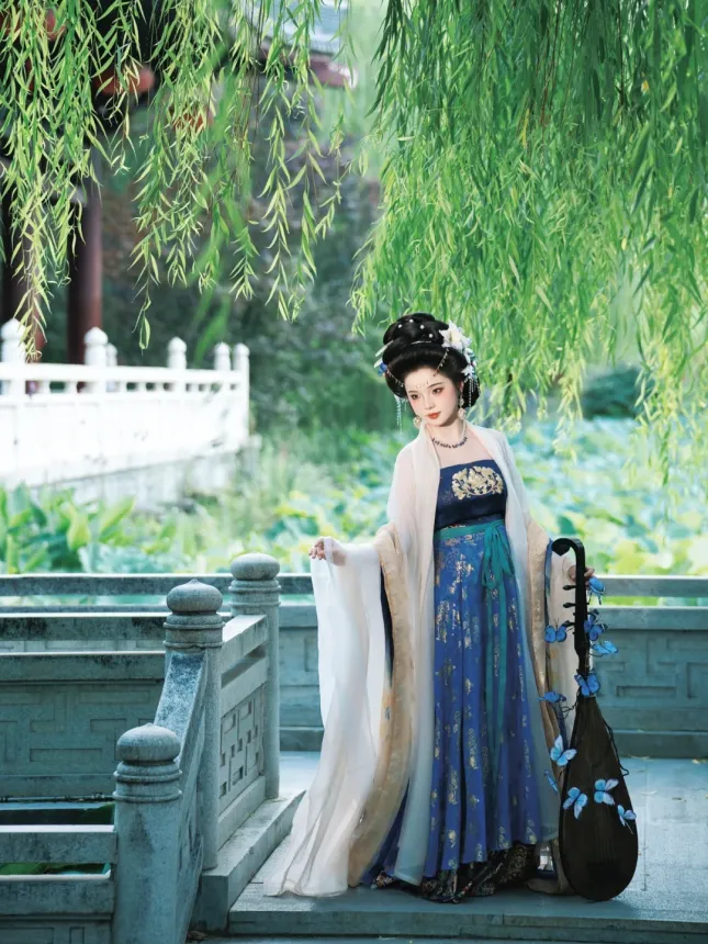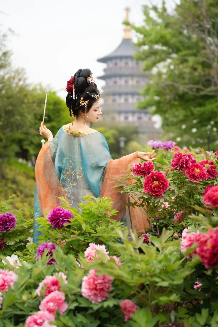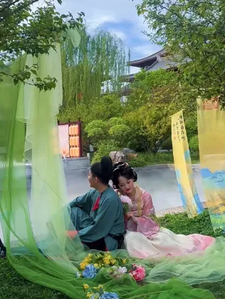 着一袭汉服,与并肩之人拍照留念,花影映眉眼,国色与心上人同框,一眼,便是岁岁年年。