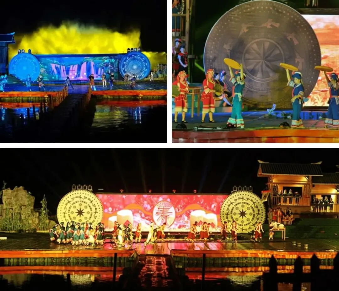 夜晚观看长寿岛的大型实景演出《梦·巴马》,以睡美人山和赐福湖为天然背景,融合瑶族婚礼、铜鼓舞等民族元素,生动展现巴马长寿文化与山水之美。
