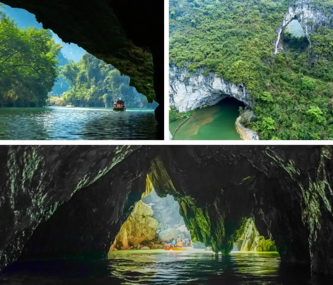 下午用餐后前往百鸟岩。该景区又名“水波天窗”,是盘阳河的地下伏流出水口,洞内有“三明三暗”天窗景观,乘船穿行其间,阳光透过天窗洒入洞中形成变幻光影。