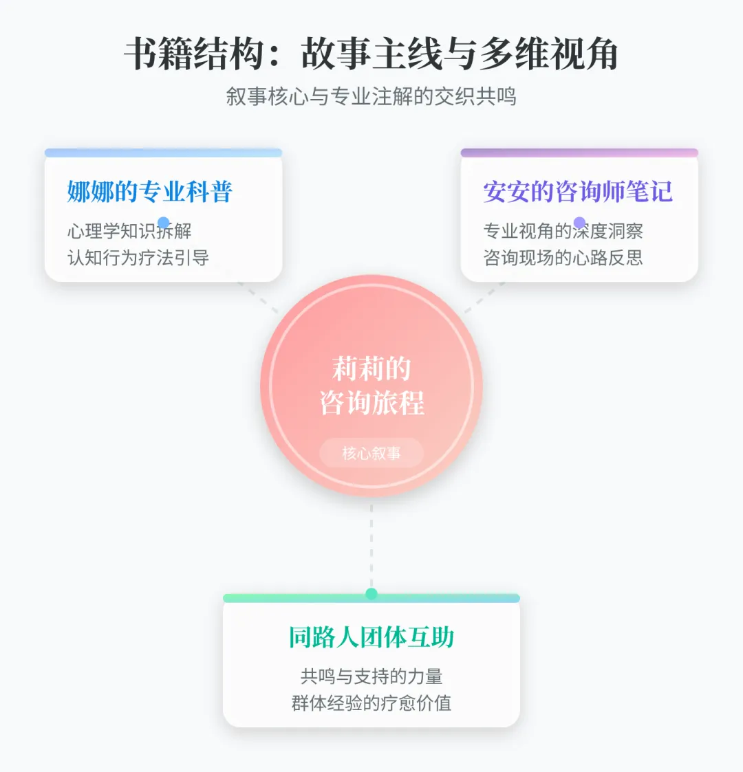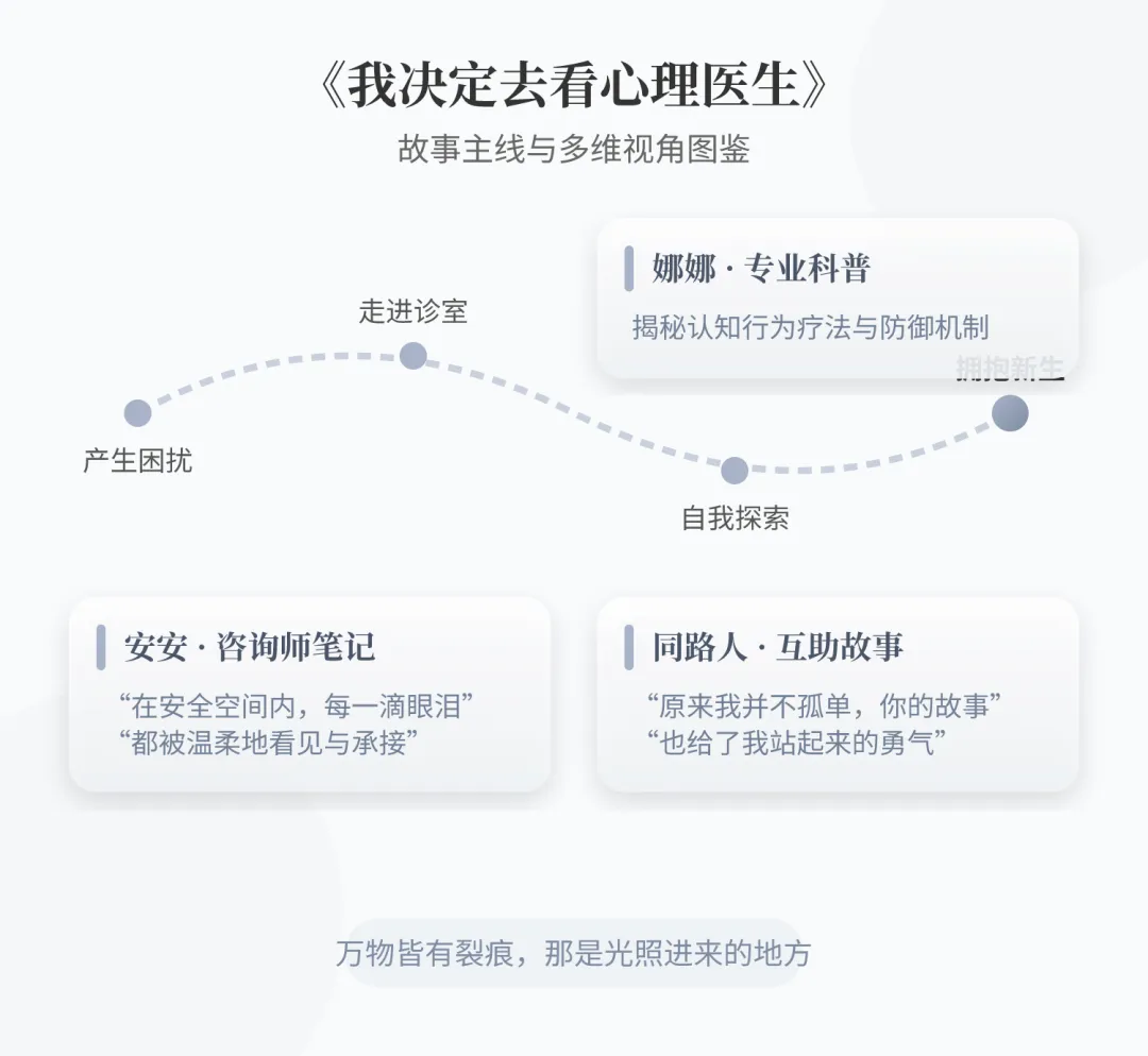 作品定位:一部融合了纪实文学、专业科普与群体支持的创新之作。它采用 “故事主线+多重视角注解” 的结构。 叙事主线:研究生莉莉因学业、人际、家庭多重压力陷入焦虑,最终决定寻求心理咨询。我们从她的视角,经历寻找咨询师、第一次会谈、建立关系、深入创伤、处理移情与依赖、直至咨询结束的全过程。 注解视角: 娜娜(心理学朋友):提供清晰、易懂的专业知识科普(如咨询设置、理论流派、常见误区)。 安安(咨询师):以案例笔记形式,揭示咨询师背后的专业思考与伦理考量。 “同路人”团体:展现其他来访者的故事与互助,传递“你并不孤单”的支持感。
