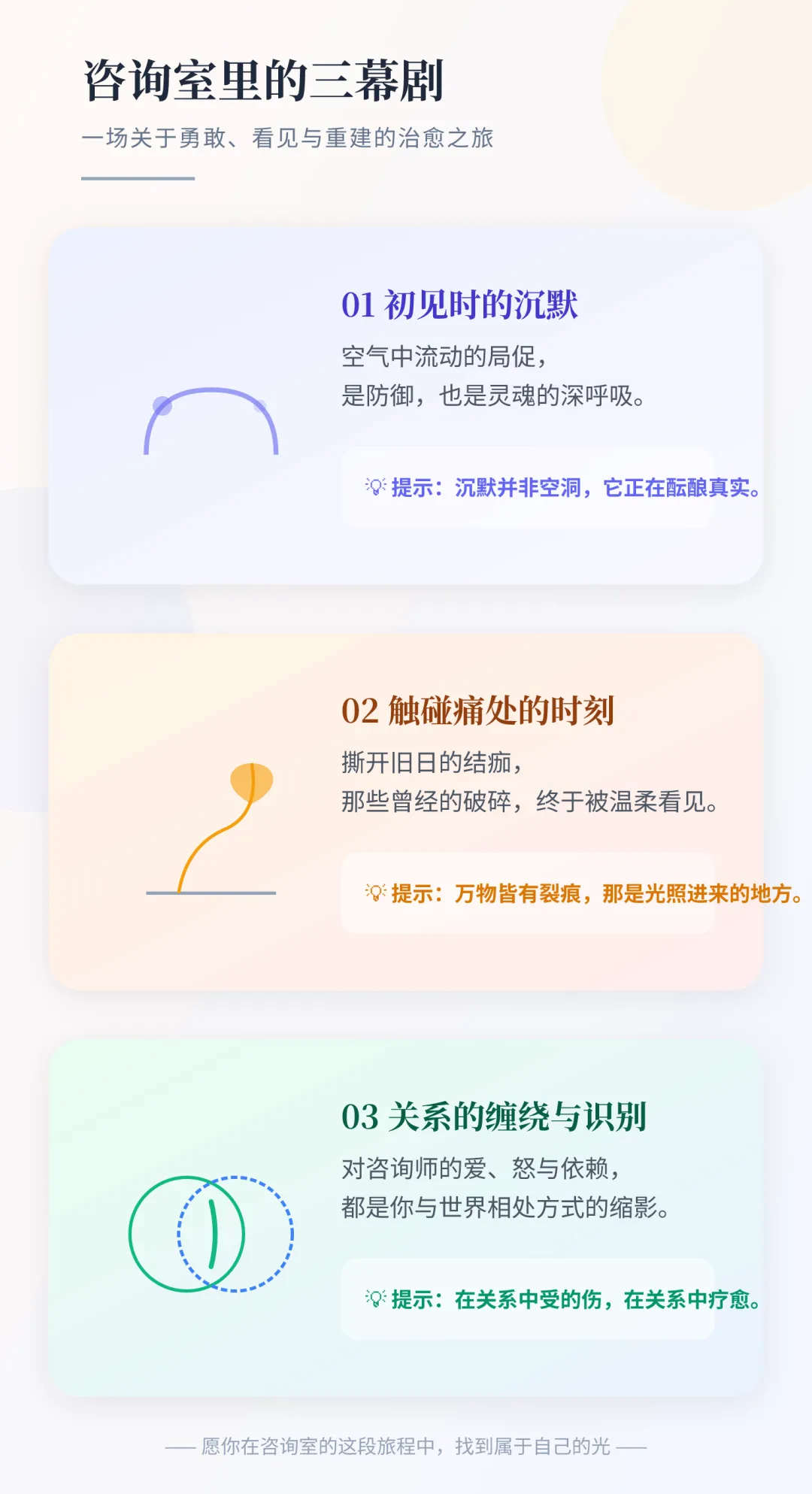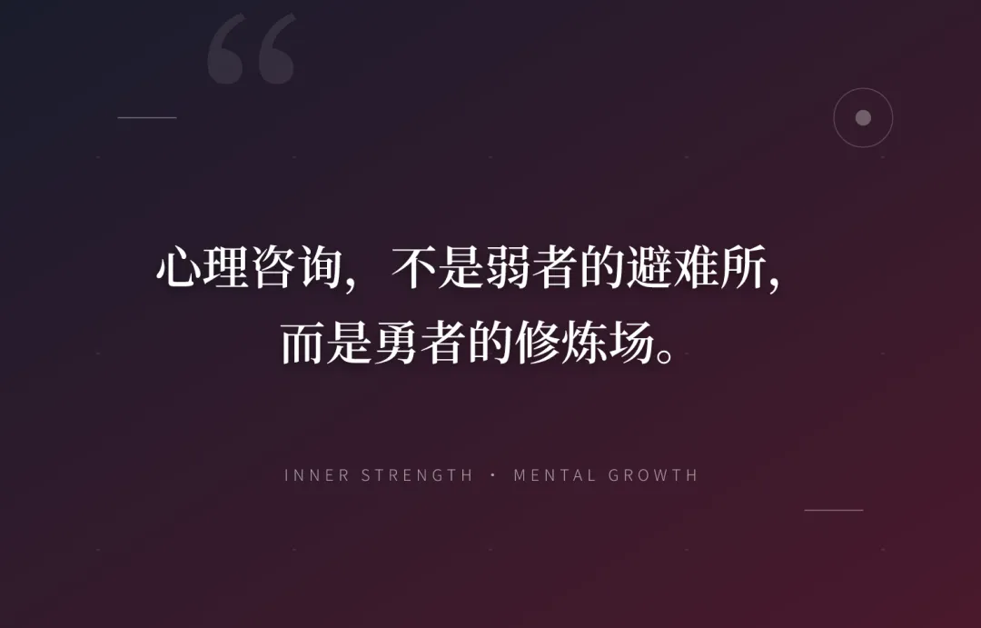 “心理咨询,不是弱者的避难所,而是勇者的修炼场。” “咨询师不是给你答案的智者,而是陪你一起寻找答案的同行者。” “第一次推开那扇门,需要的勇气,不亚于面对任何一场人生的重大考试。” “在咨询室里流出的眼泪,和在外面独自忍受的眼泪,有着本质的不同——前者被见证,后者被埋葬。”
