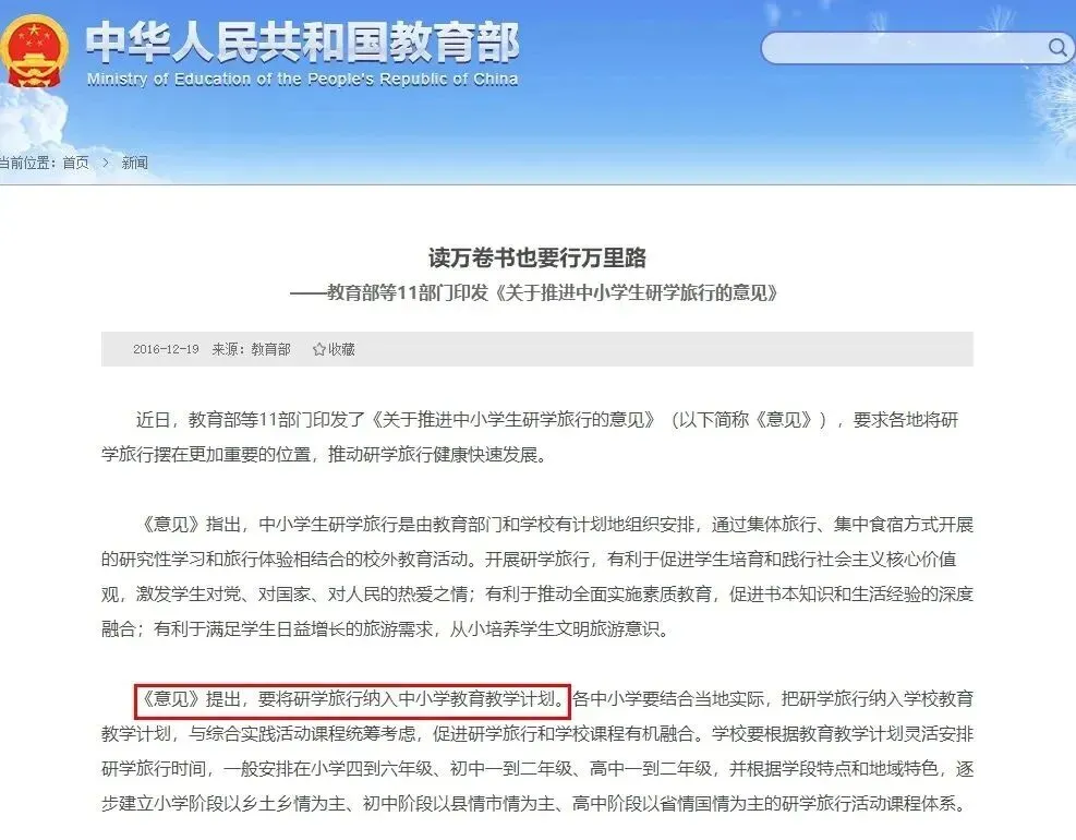 2016年,教育部等11个部门发布《关于推进中小学研学旅行的意见》,首次将研学旅行纳入国家教育政策;要求各中小学要结合当地实际,把研学旅行纳入学校教育教学计划,与综合实践活动课程统筹考虑,促进研学旅行和学校课程有机融合。