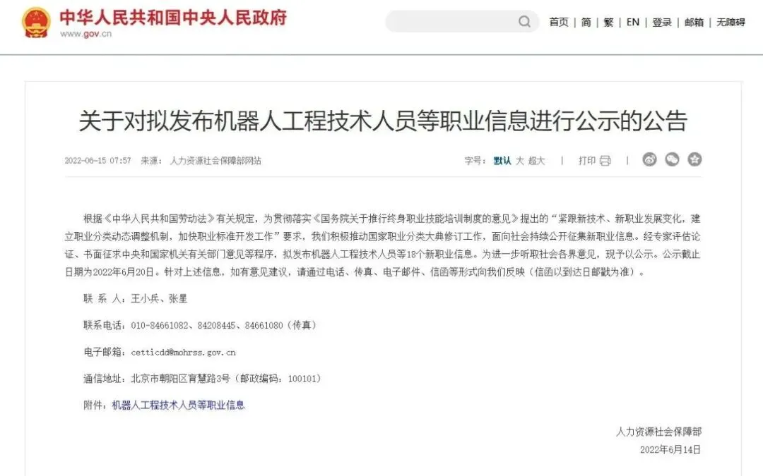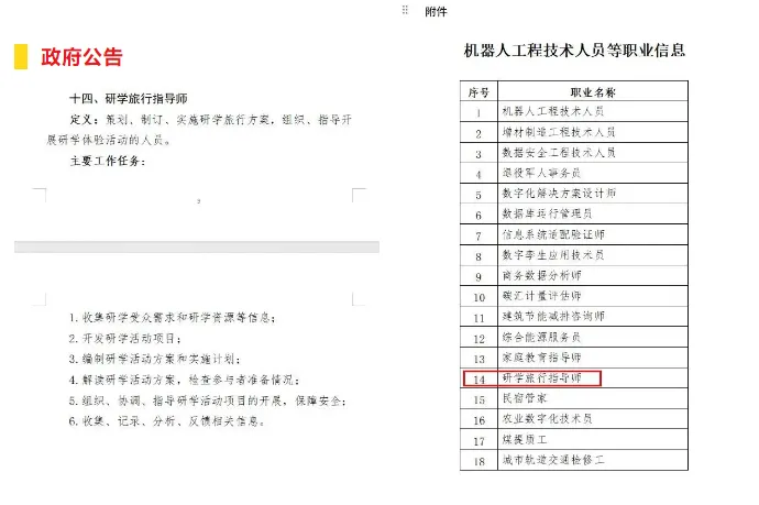 2022年6月14日,人力资源和社会保障局发布《关于对拟发布机器人工程技术人员等职业信息进行公示的公告》,公告包含了18个新职业信息,向社会公示并广泛征求意见。其中包括研学旅行指导师、家庭教育指导师、民宿管家等职业信息。