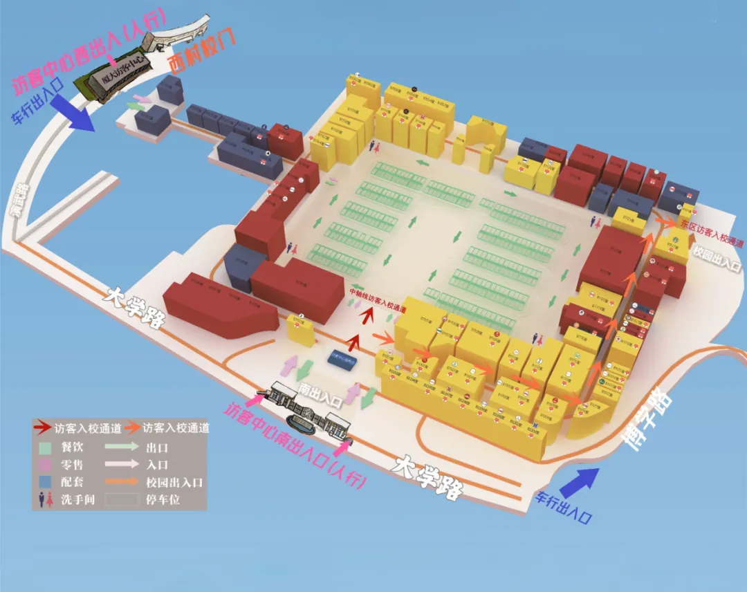 ①从演武路厦大西村→厦大访客中心西出入口→下扶梯左转直走→霹雳堡&Gamurai右转直走→直走经沐可的茶&两山驻海&厦大南强文创→直走左转穿门继续直走至大喜饭团→走出玻璃门经客服台→往停车场方向绕过大屏幕后方→走上台阶走至访客通道