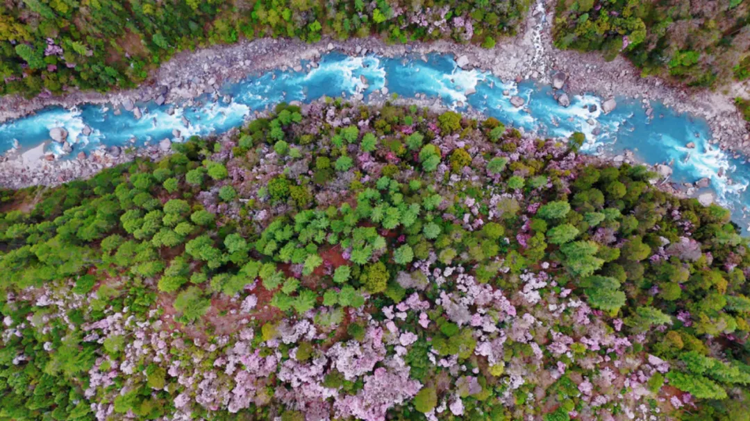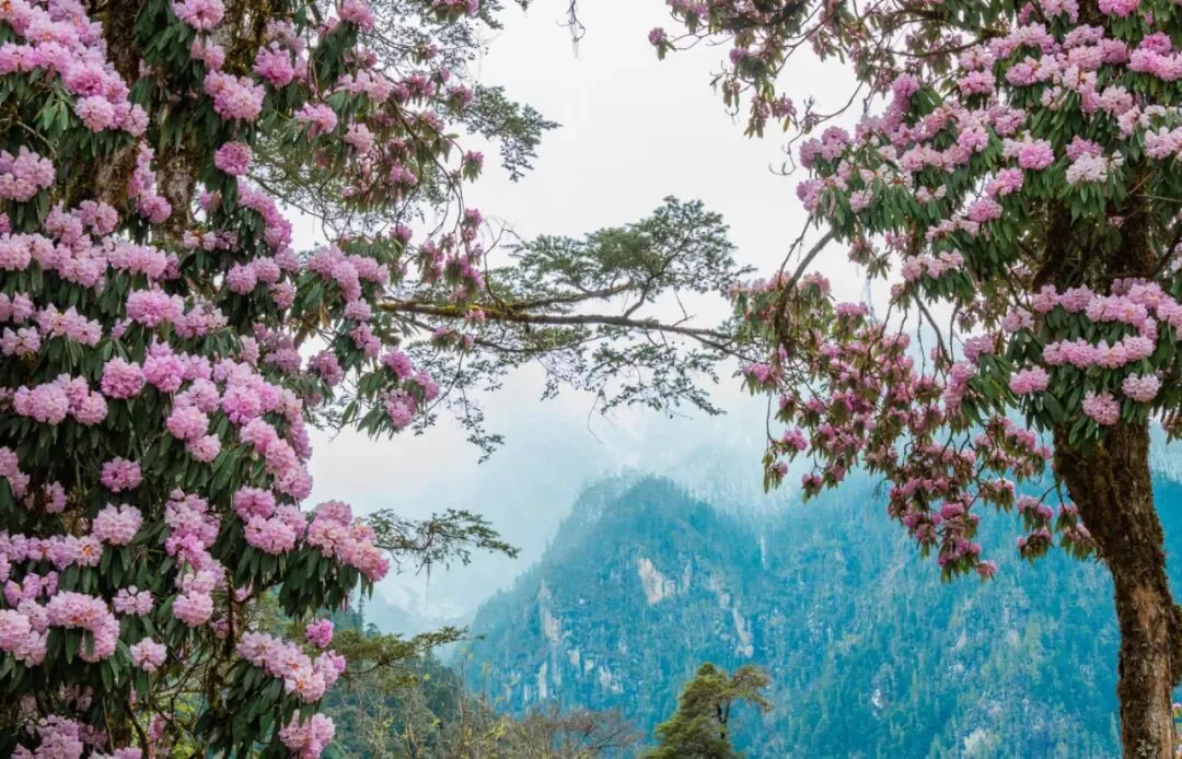 沿着蜿蜒的帕隆藏布江而上,海拔渐次攀升,八盖乡的高山杜鹃正在云端怒放。与平原杜鹃不同,八盖的杜鹃是高原的精灵——树龄可达数百年,枝干苍劲,花朵却娇艳欲滴。粉白、玫红、淡紫,成片铺展在雪山脚下、峡谷两侧,仿佛大自然打翻了调色盘。