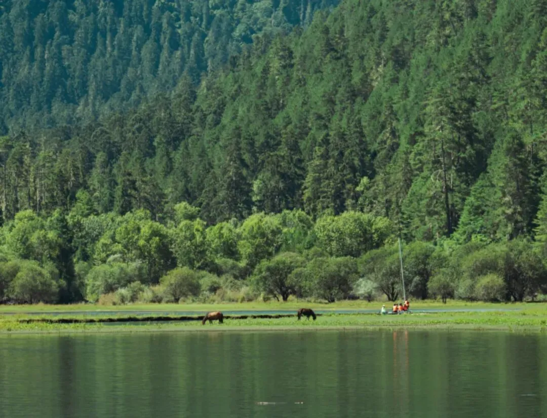 草湖徒步:林间有一片静谧的高山草甸湿地,湖水倒映雪山森林,是绝佳的野餐点