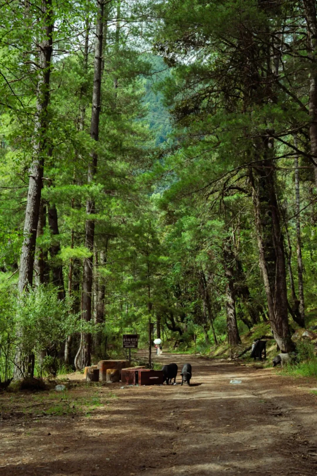 岗云杉林被《中国国家地理》评为“中国最美十大森林”之一。走进林间,高大挺拔的云杉遮天蔽日,松萝垂挂,苔藓铺地,空气里弥漫着松脂的清香和泥土的湿润。阳光从树冠缝隙洒下,光束在雾气中清晰可辨。在这里,每一次呼吸都是洗肺之旅。负氧离子浓度极高,高原的干燥与疲惫仿佛都被这片原始森林温柔抚平。