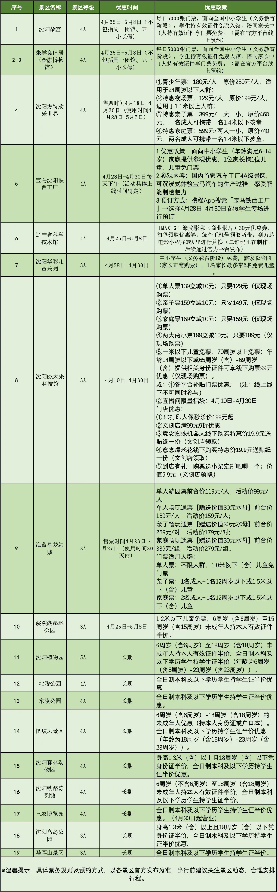 ▶沈阳植物园、北陵公园、东陵公园、怪坡、森林动物园等 9家重点景区,学生持学生证享半价优惠。(优惠详见下方表格,具体票务规则及预约方式,以各景区官方发布为准)。