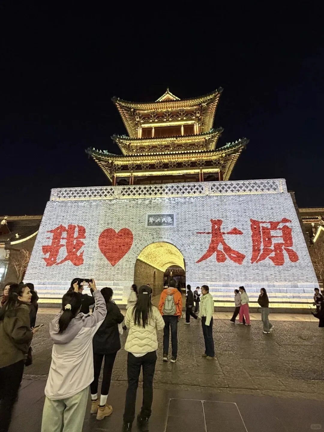 你看那个五一广场的晚上,灯光打在那座老建筑上,下面写着大大的“我❤️太原”,这行字不矫情,因为它背后站着的是一座活了两千多年的城,你站在钟楼街的人流里,周围是热闹的店铺和熙攘的人群,那种热闹不是演出来的,是本地人实实在在过日子的动静,你不用刻意去找机位,随便往那一站,背景里的烟火气就足够把你包裹住,这种安全感是别的城市给不了的。