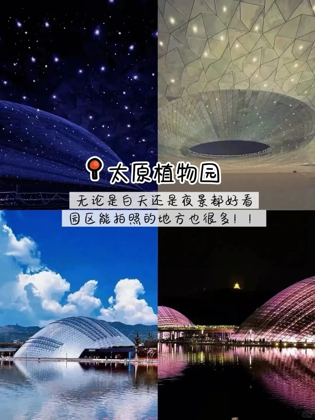 再往南走一点,到了太原植物园,你会觉得时间突然跳了一下,那个大穹顶晚上亮灯的时候像外星基地,白天看又是另一种几何美感,尤其是春天郁金香开的时候,一片一片的红色粉色铺在地上,跟那个充满未来感的建筑放在一起,不冲突,反而让你觉得时间在这里是折叠的,你不用穿越,走两步就能从现代走到古代,这种体验很奇妙,因为它不把你当游客哄着,它就是把日子摊开给你看。