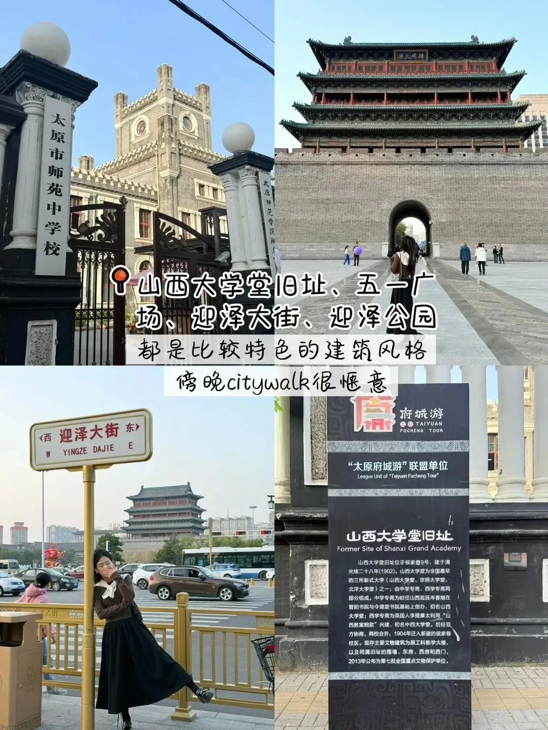 走到迎泽大街和山西大学堂旧址这一块,那种民国风的味道就更浓了,灰色的砖墙,西式的柱子,跟旁边的公交车站、马路上的车流混在一起,你走在里面,就像走在电影镜头里,但这种镜头感不假,因为房子是真的,历史是真的,你摸上去那个砖石的凉意是真的,傍晚在这里citywalk很惬意,不用赶时间,就慢慢走,看那些老建筑怎么在现代社会里活着,这本身就是一种很深的阅读。