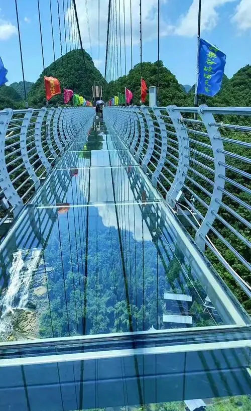 玻璃吊桥是这条线路的收尾项目,下午两三点去最合适,因为这个时间段光线正好,拍照效果最好。这座吊桥长度有一百多米,横跨在两座山之间,桥面全是透明玻璃,走在上面能直接看到下面几十米深的山谷,有些人第一次上去腿会发软,但习惯了之后就会觉得特别刺激。