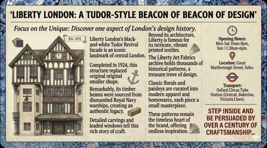 Liberty London被2625101班的Ethan和Noa等同学做成了一份都铎风格的设计档案。他们围绕建筑溯源及工艺设计两大板块,充分诠释了传统与先锋的碰撞。宣传册整体设计注重视觉与内容的统一,图文搭配突出建筑的木构细节与印花图案,语言兼具信息性与感染力,既传递了历史厚度,也呈现出审美格调。