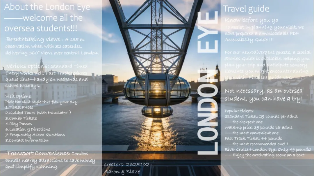 2625102班的Aaron和Blaze等同学选择了现代地标伦敦眼。面向海外学生,他们的设计风格简洁明快,突出实用性与信息引导。开篇以欢迎语切入,强调伦敦眼的360度全景视野,随后清晰列出标准票、即买即走票、快速通道票等不同类型,并标注价格与推荐场景,便于读者快速比较。不仅如此,这则宣传册专门设置“行前须知”板块,提及无障碍指南,充分体现了人文关怀。