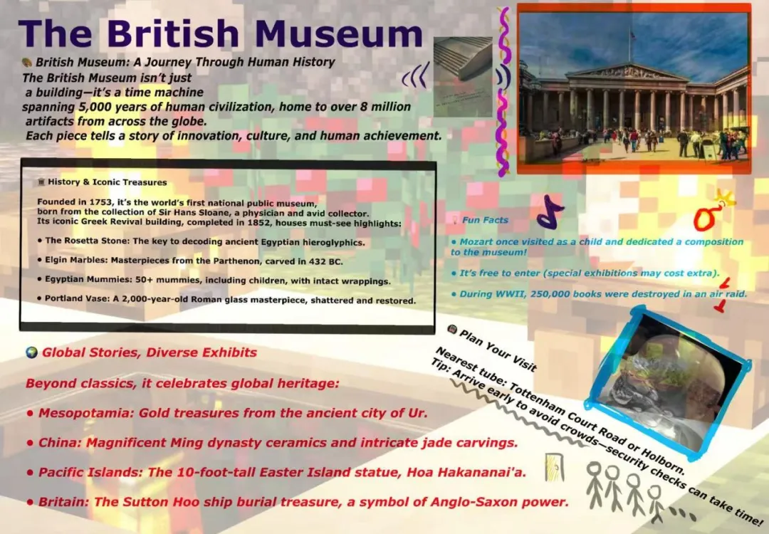 大英博物馆的宣传页来自2625103班的Lapis等同学。通过列举罗塞塔石碑、埃尔金大理石雕、埃及木乃伊、波特兰花瓶等核心藏品,突出其文化与考古价值。宣传册整体设计注重内容分层与阅读节奏,以小标题、项目符号、重点加粗等方式提升信息可及性,同时通过“time machine”“iconic treasures”等表述营造沉浸感与探索氛围,兼具教育功能与旅游推广属性。