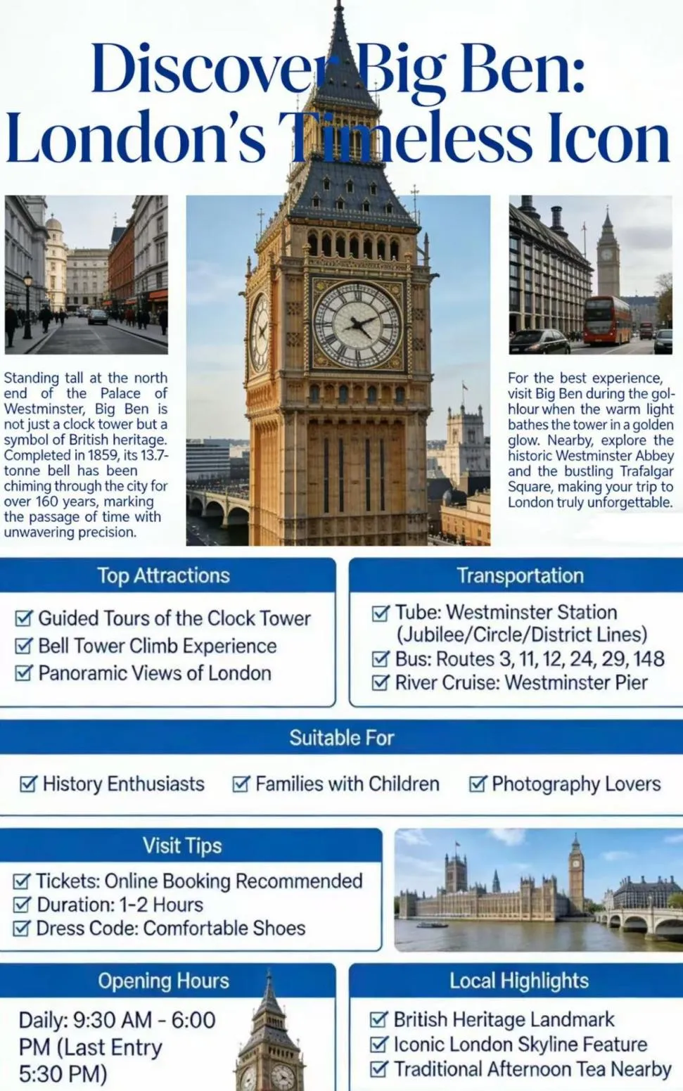 来自2625201班的Vector等同学将大本钟定义为“伦敦永恒的标志”。他们以条目式列出钟楼导览、登塔体验、全景视野三项核心活动,并分别面向历史爱好者、家庭游客、摄影爱好者,便于读者对号入座。宣传册信息分层清晰,涵盖钟楼导览、登塔体验、开放时间、交通建议等方面,便于不同需求的读者快速获取内容。