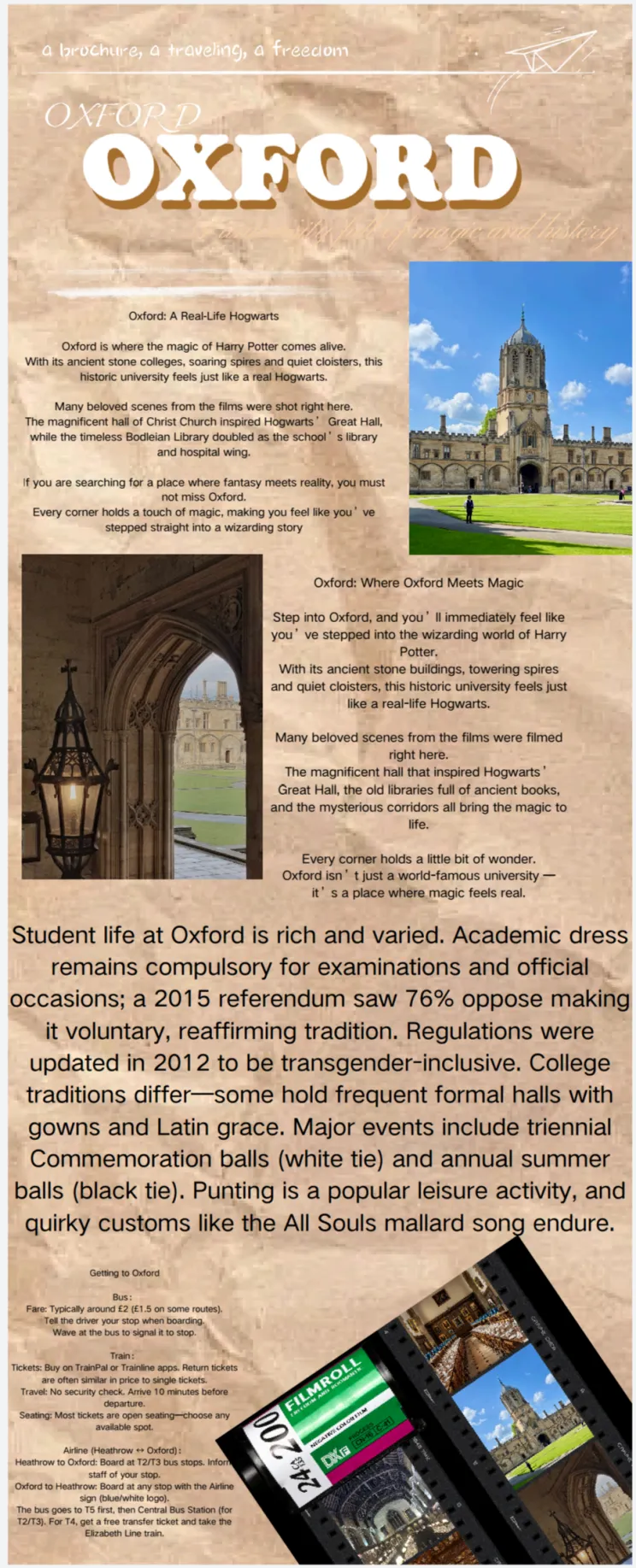 牛津大学的古老学院与学术传统被浓缩于方寸之间,来自2625202的Sunny等同学以魔法主题切入,开篇以“现实版霍格沃茨”为核心概念,营造“奇幻与现实交汇”的氛围。随后介绍了牛津真实的学术传统,如盛装舞会以及万灵学院“野鸭颂”等独特习俗,体现校园文化的厚重与趣味。后半部分则提供了详实出行信息,详细列出了三种前往牛津的方式。适合不同需求的读者——有人读情怀,有人看传统,有人查交通。