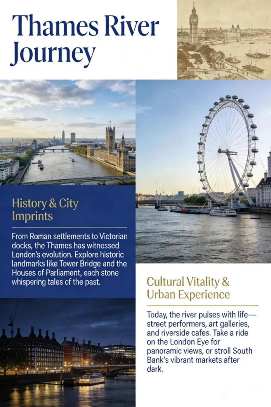 泰晤士河的宣传页最为简洁凝练,2625203班的William等同学只用两条线——历史脉络与当代活力——就勾勒出河流与城市的共生关系。从罗马码头到南岸的街头艺人,几句话带出画面感。并通过意象(“river pulse”“stone whispering”)传递河流的文化气质,用最少的文字唤起读者对泰晤士河历史深度与都市活力的想象。