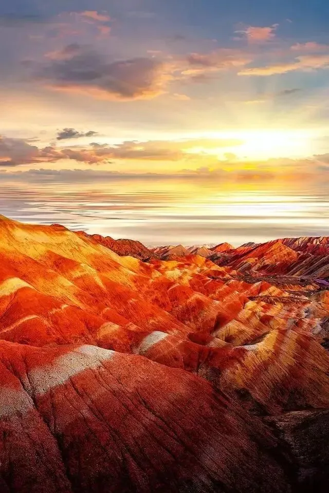 36 张掖七彩丹霞 独具特色的丹霞地貌。 红黄蓝绿的色调顺着山势起波浪起伏,犹如斜铺的彩布,在阳光的照射下,熠熠泛光,让人惊叹。
