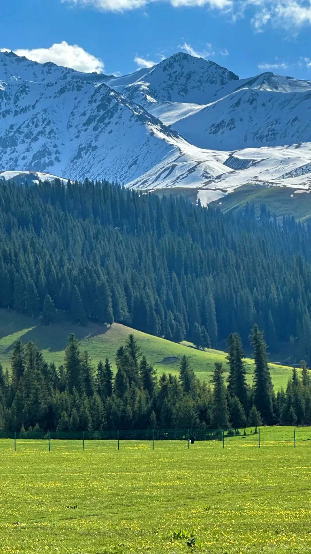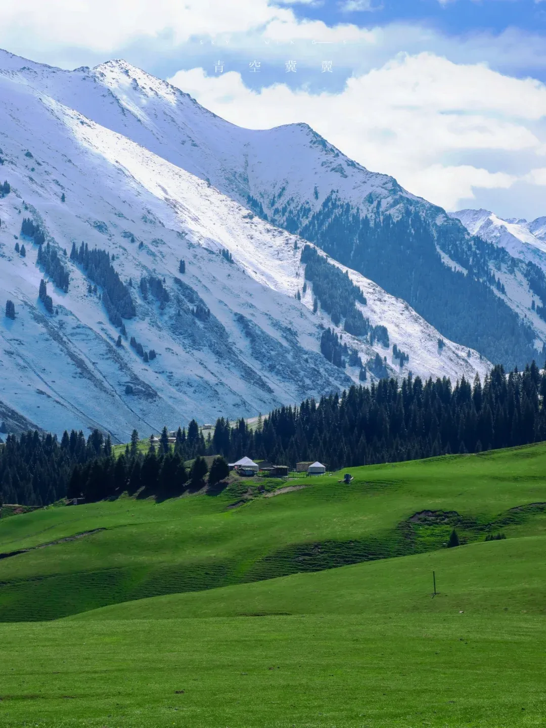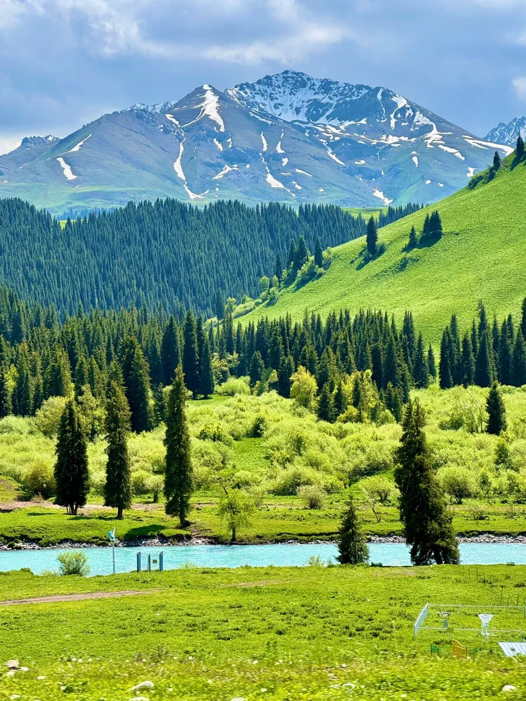 恰西绿得最早,每年4月20号左右,草就开始绿了。这里风景很全,雪山、草原、森林、溪流,一层一层的,像一幅画非常美。恰西画卷是必打卡观景台,能360°欣赏草原美景。