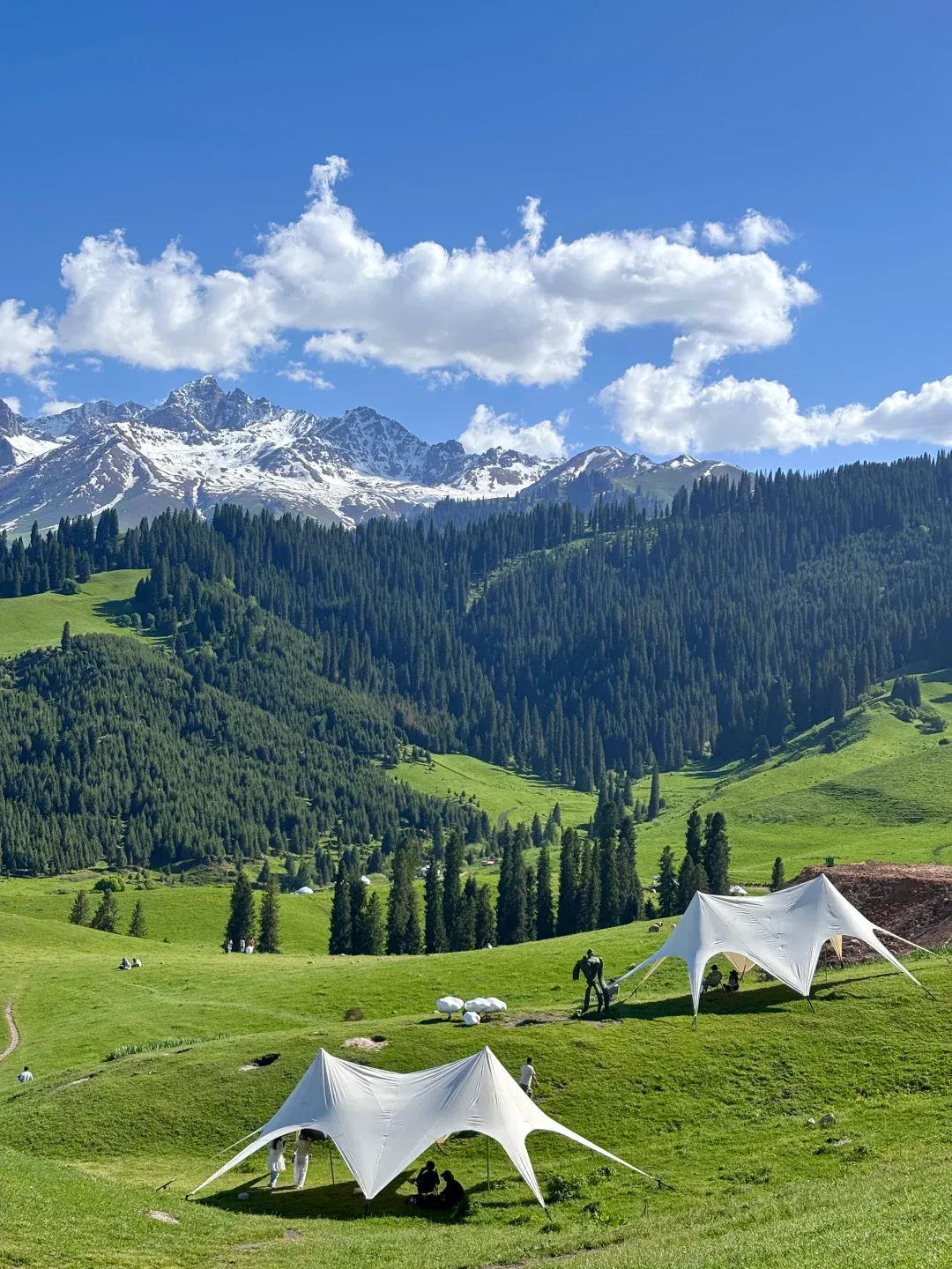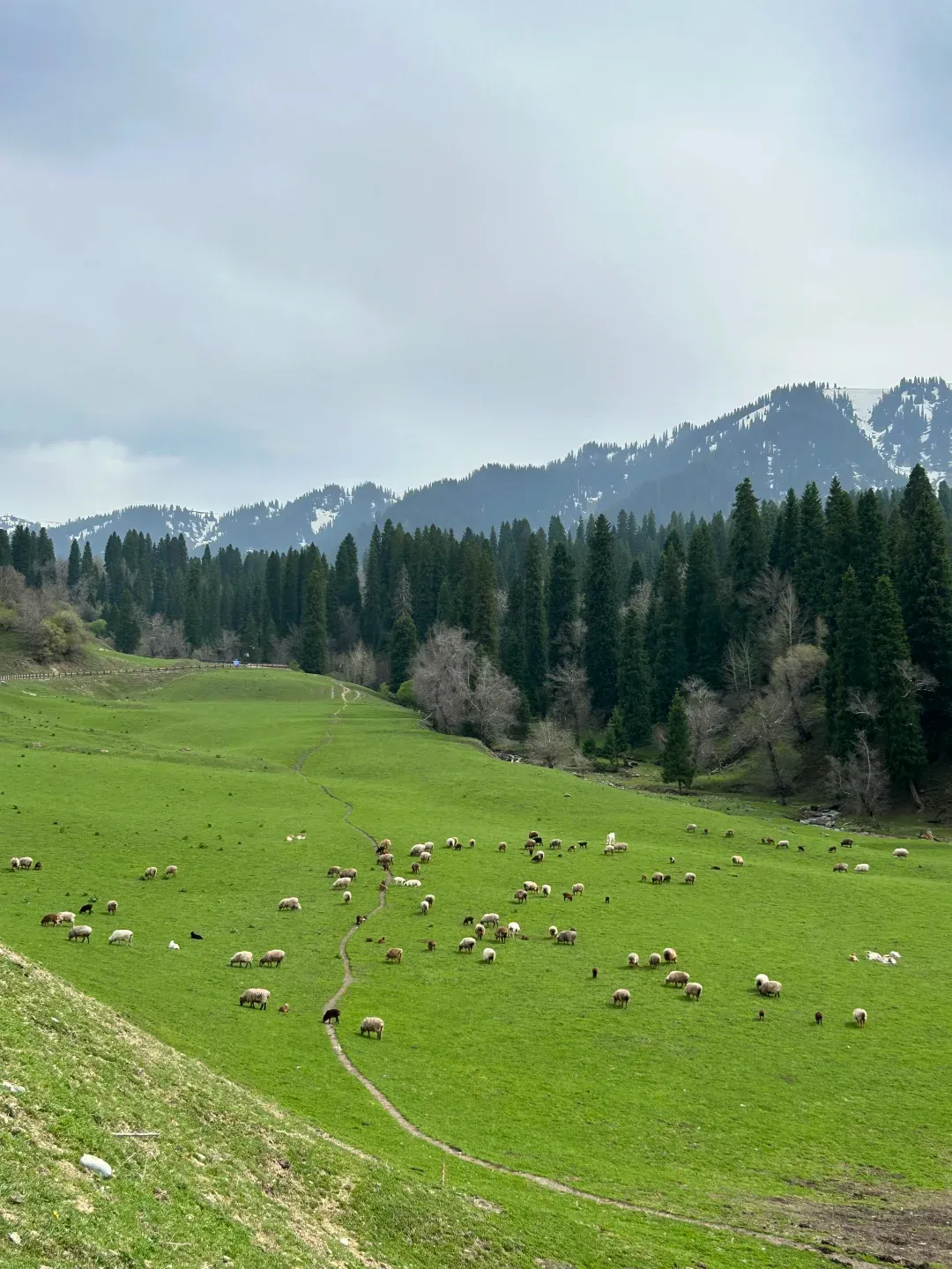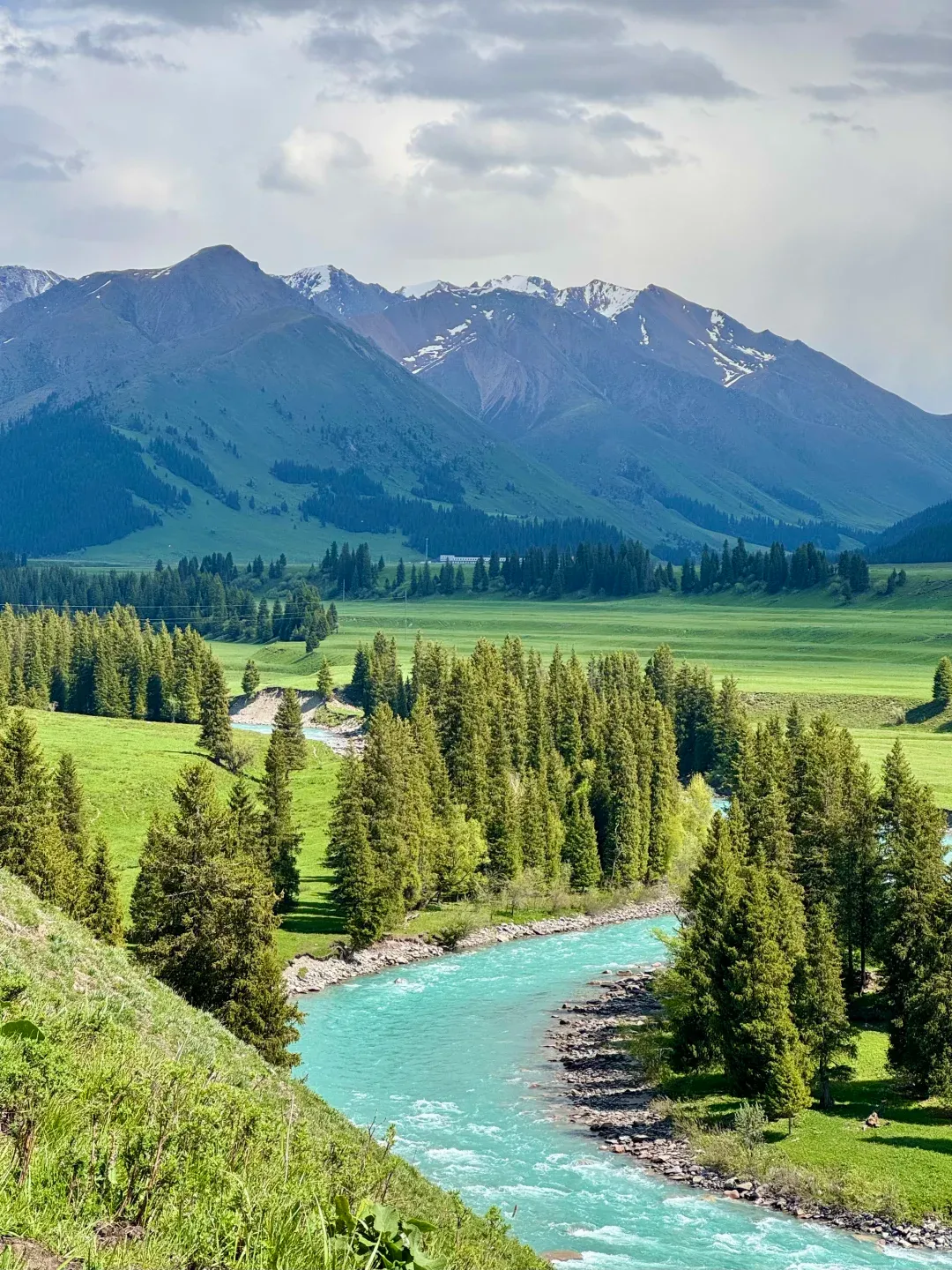 恰西绿得最早,每年4月20号左右,草就开始绿了。这里风景很全,雪山、草原、森林、溪流,一层一层的,像一幅画非常美。恰西画卷是必打卡观景台,能360°欣赏草原美景。